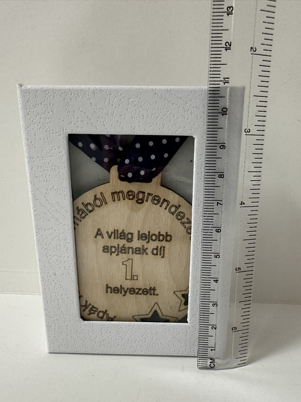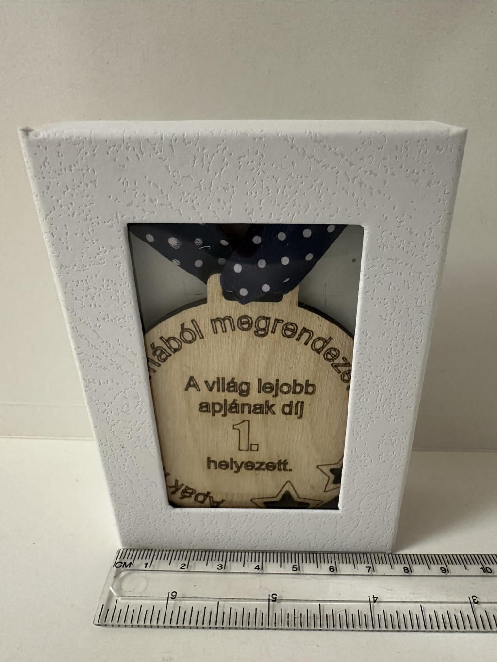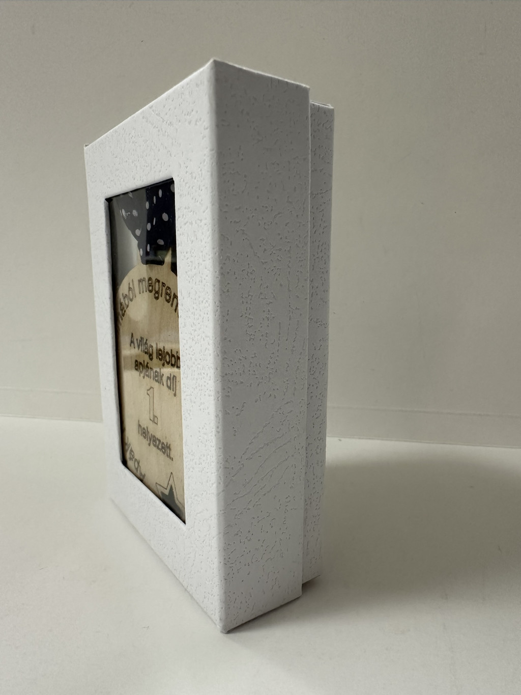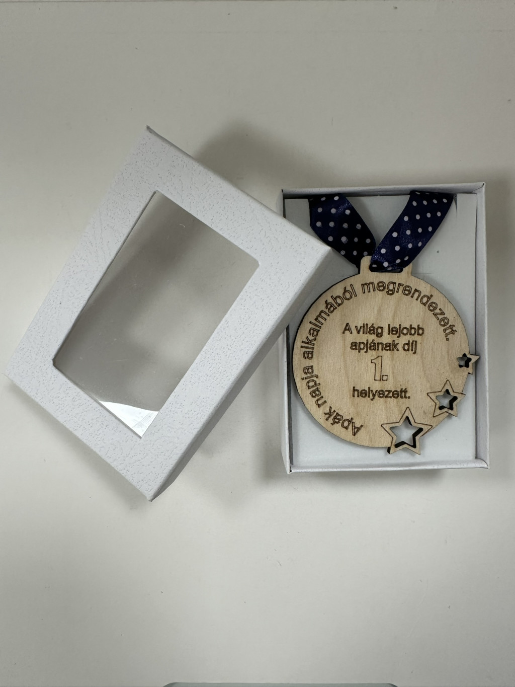A pontozott mintás kék szalaggal a nyakba is akasztható, így akár ünnepélyesen is átadható, igazi "dobogós" pillanatot varázsolva. A csomagolása sem hétköznapi: elegáns, fehér díszdobozban érkezik, átlátszó ablakkal, ami még különlegesebbé teszi az ajándékozás élményét.
