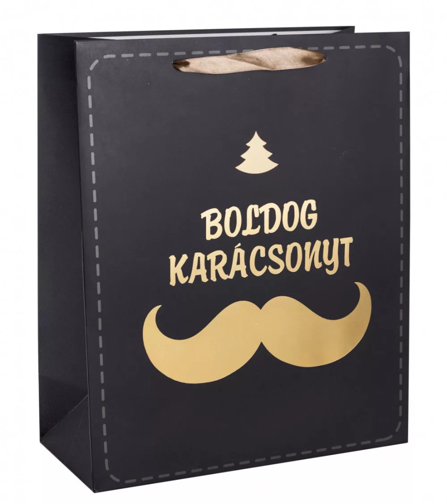 Ez a fekete-arany ajándéktáska az egyik legelegánsabb és legkülönlegesebb darab azok számára, akik stílusosan szeretnék átadni karácsonyi meglepetéseiket. A matt fekete alapot látványosan emeli ki a fényes arany „Boldog Karácsonyt” felirat és a játékos, mégis ízléses bajusz motívum – tökéletes választás férfiaknak szánt ajándékok csomagolásához!