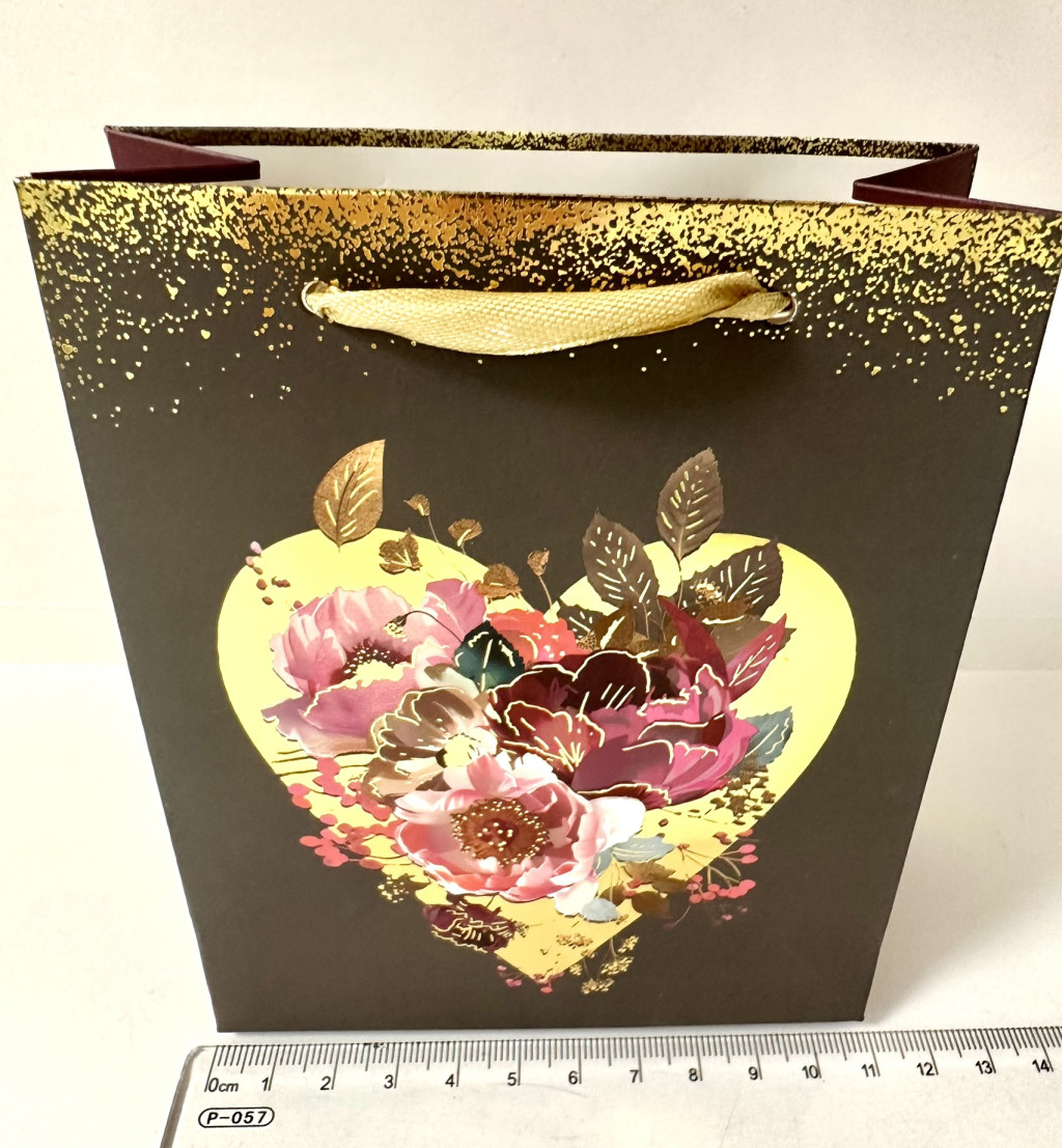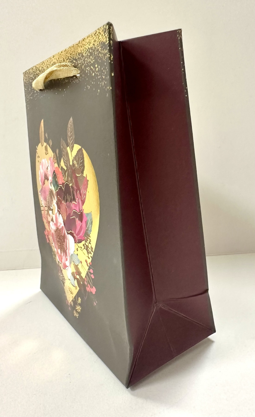 A sötét alapon ragyogó arany szívben elhelyezett virágkompozíció igazi prémium hatást kelt. A dísztáska minden részletében minőséget sugall: a fényes arany nyomat, a bordó oldalsáv és a selymes arany fül mind az ajándékozás ünnepi hangulatát erősítik.