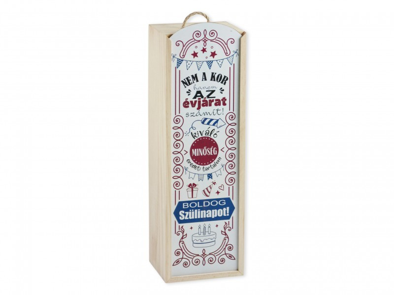 A „Nem a kor számít, hanem az évjárat!” feliratú fa bortartó díszdoboz garantált mosolyt csal az ünnepelt arcára. Ez az a fajta ajándék, amit nem csak átadnak… hanem meg is jegyeznek.