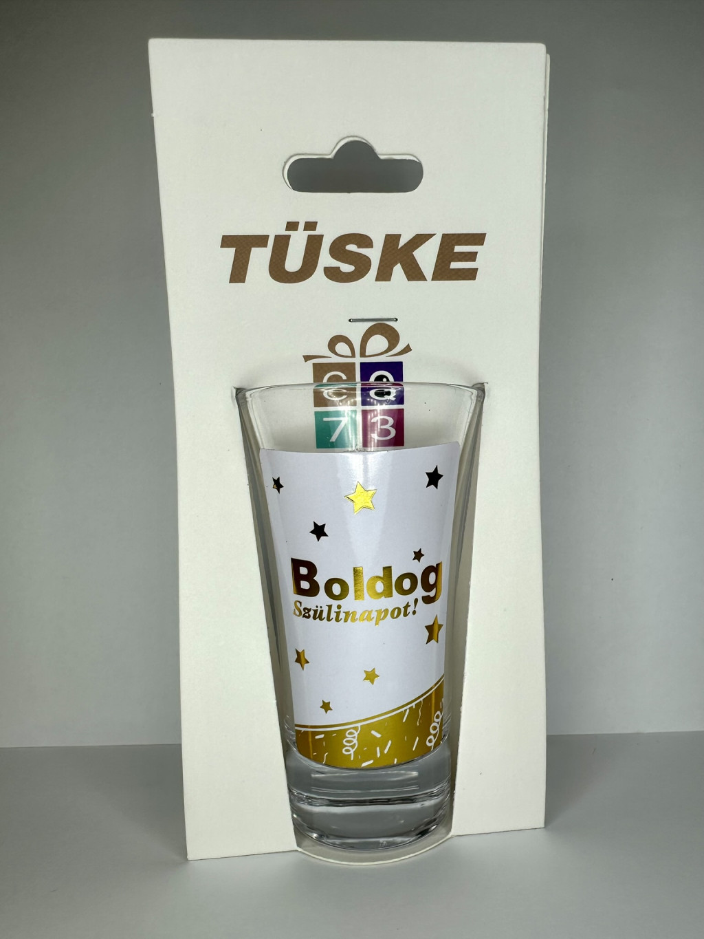 A Boldog Szülinapot – Ünnepi pálinkás pohár 9 cm magas, strapabíró üvegből készült, elegáns arany csillagokkal és vidám felirattal díszítve.
