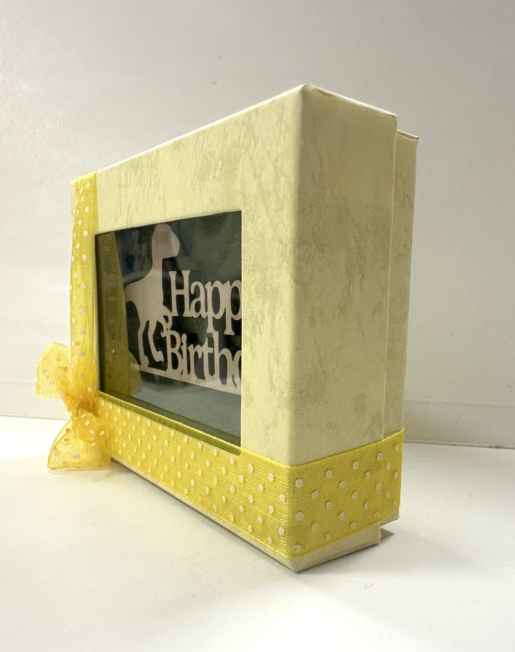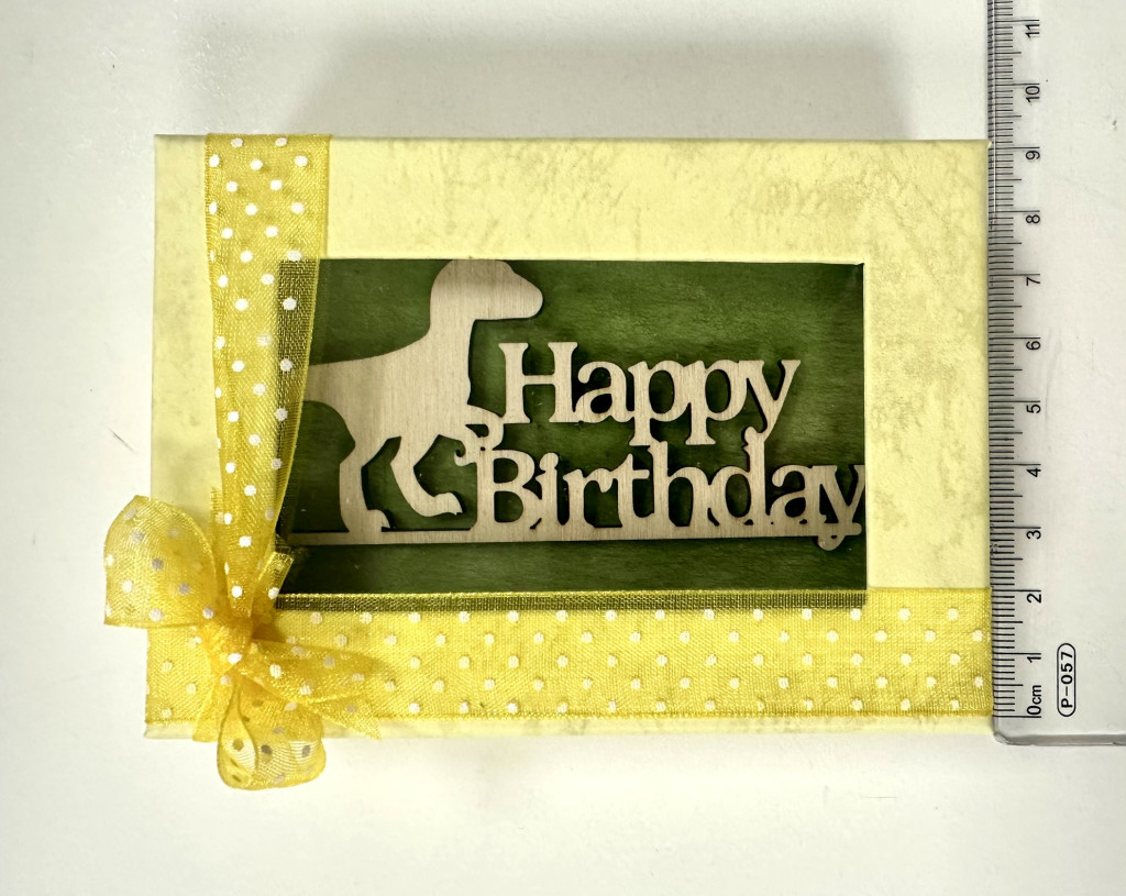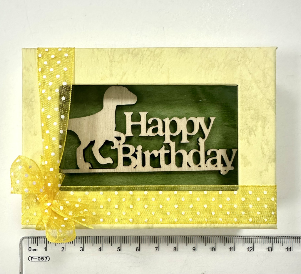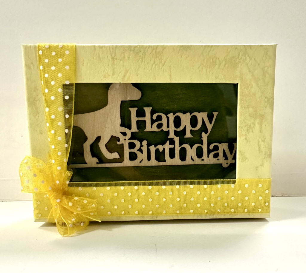 Ez a sárga pöttyös szalaggal díszített, zöld betétlapos, betekintő ablakos doboz különleges élményt nyújt már az első pillanatban. A dobozban lévő lézervágott „Happy Birthday” felirat mellett egy cuki dinoszaurusz is helyet kapott – ami garantáltan feldobja a szülinapi meglepetést.