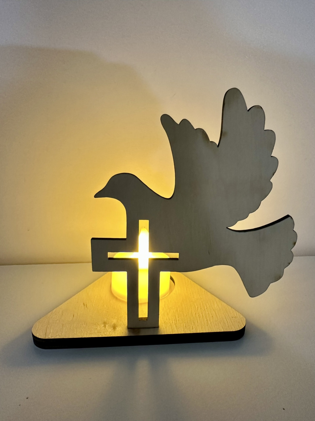 A lágyan pislákoló LED mécses fénye finoman világítja meg a galamb és a kereszt formáját, így különleges, megnyugtató hangulatot teremt, akár az otthonod dísze, akár megemlékezés része.