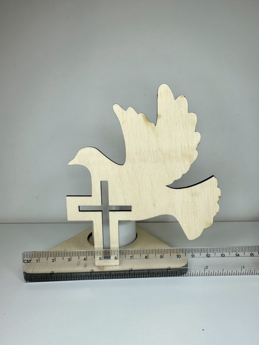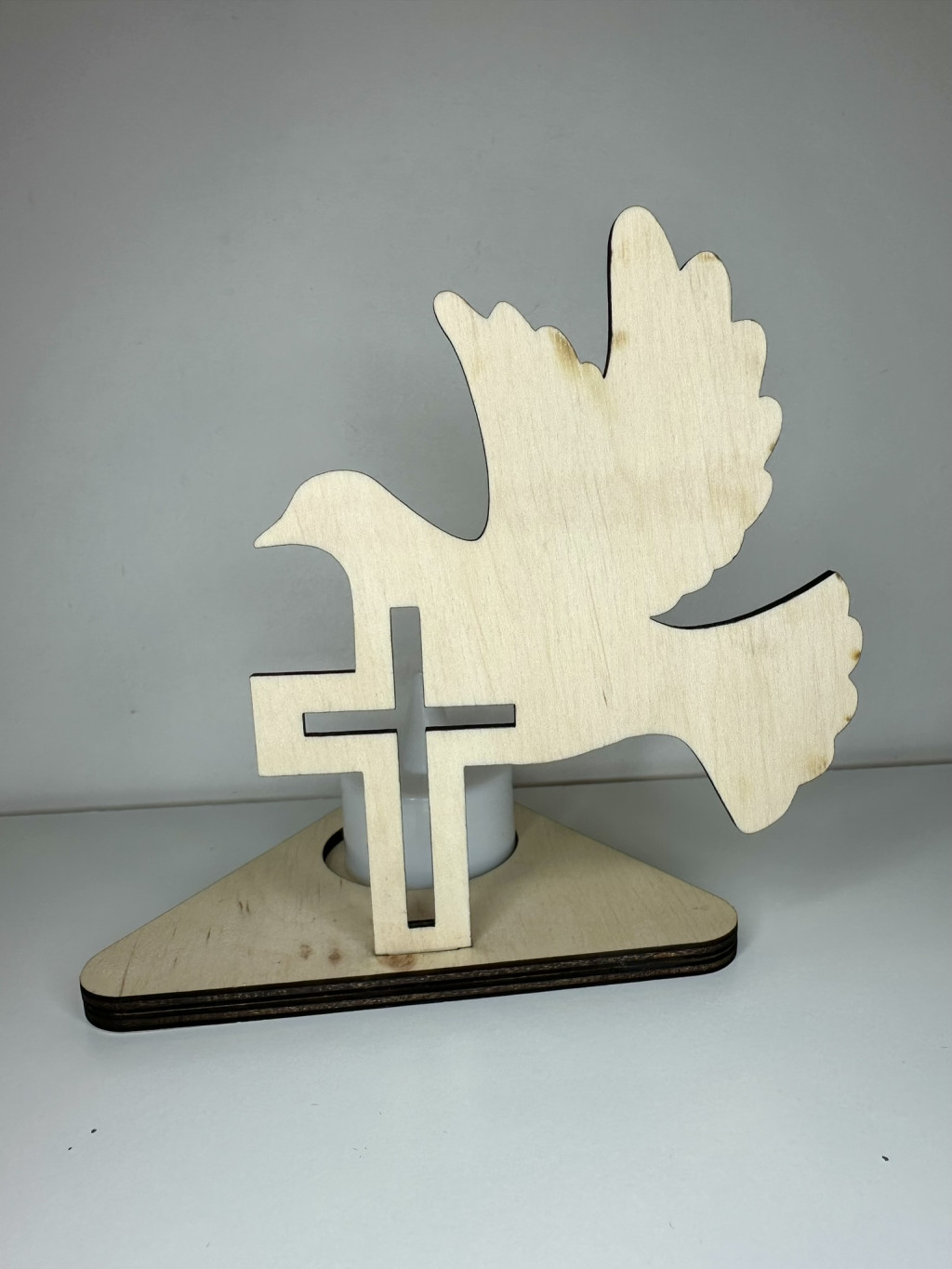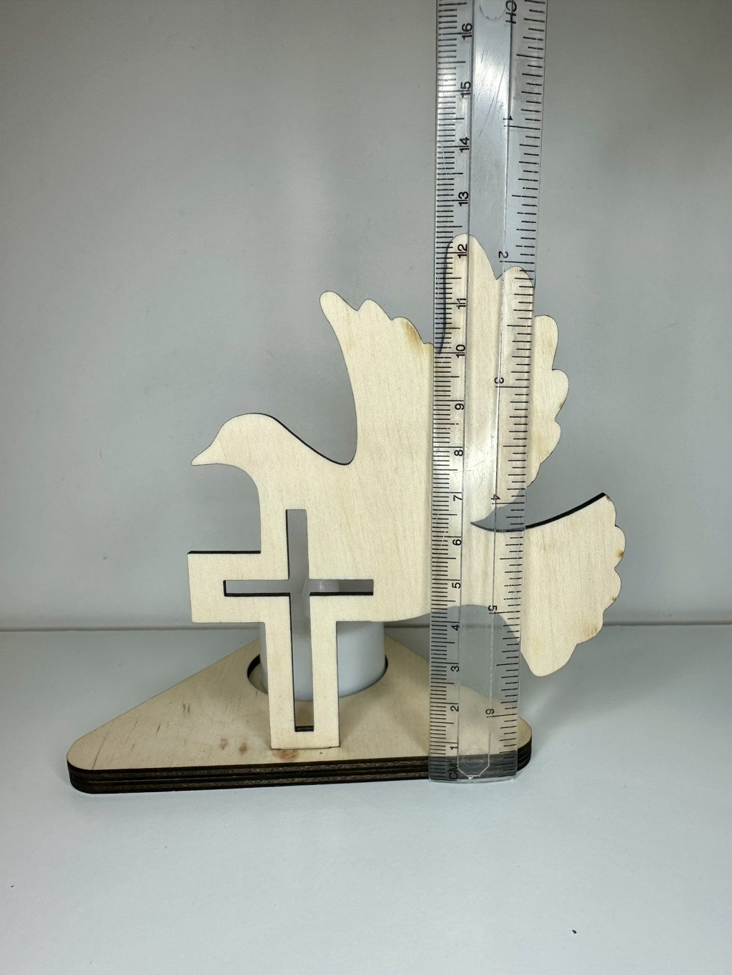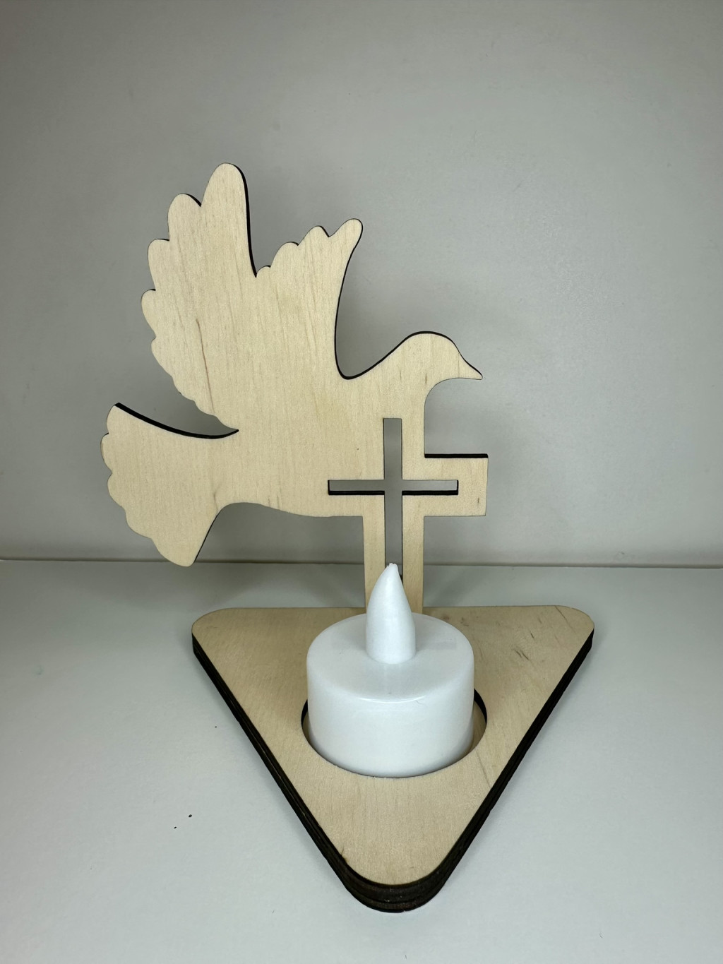 Fa mécsestartó, galamb és kereszt motívummal – a béke, hit és szeretet jelképe. Meghitt hangulatot teremt otthonodban vagy megemlékezéskor.