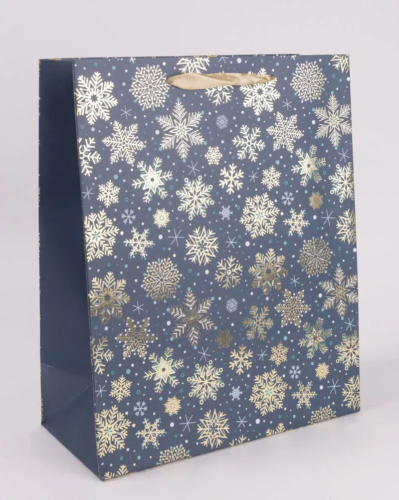 A szezon egyik legkülönlegesebb darabja: mély sötétkék alapon csillogó, arany fóliás hópelyhek díszítik, amelyek varázslatos, téli hangulatot teremtenek már az átadás pillanatában. A prémium minőségű vastag karton és az elegáns arany szaténfül biztos tartást ad, így nagyobb, súlyosabb ajándékokhoz is kiváló választás.