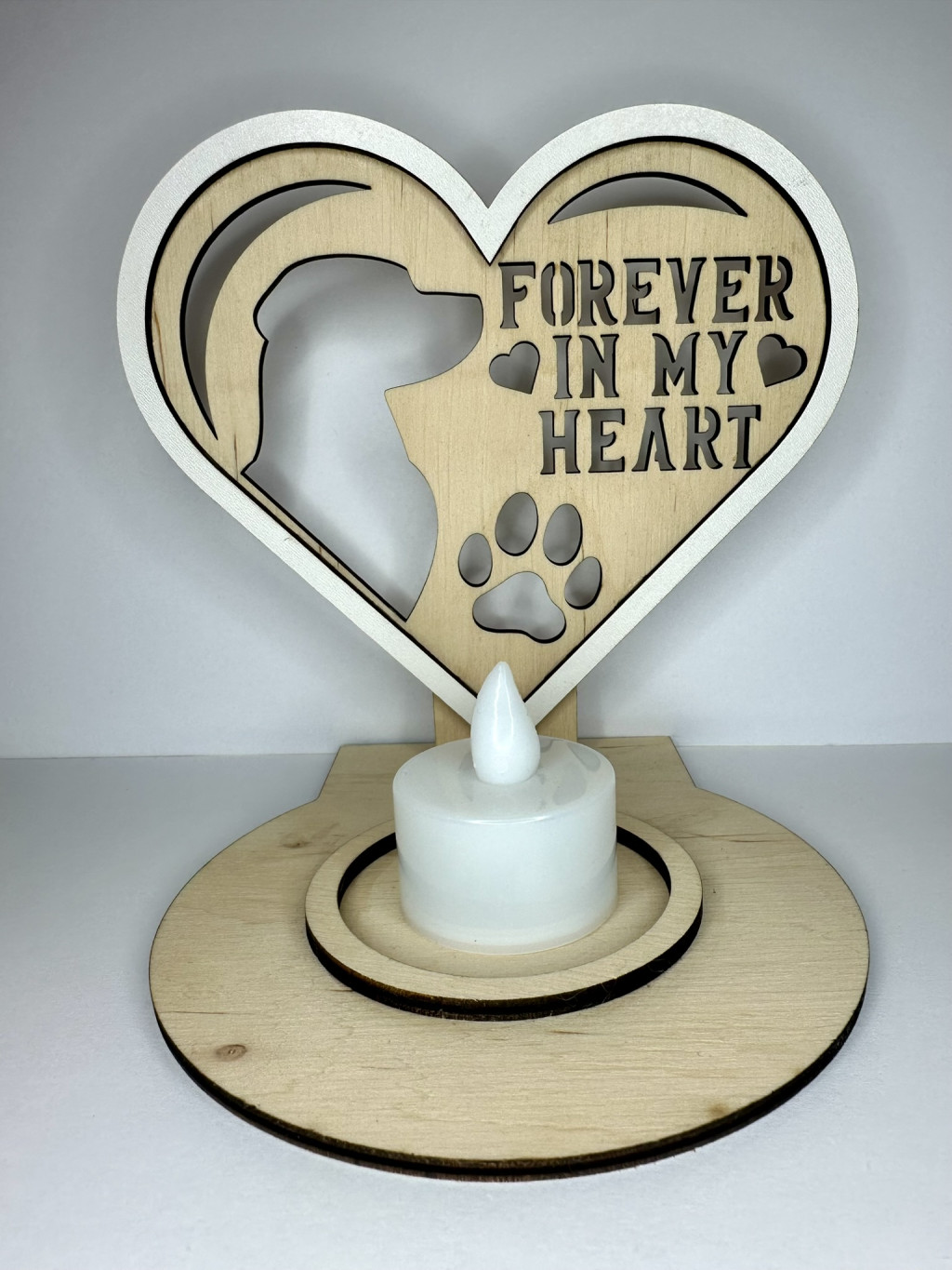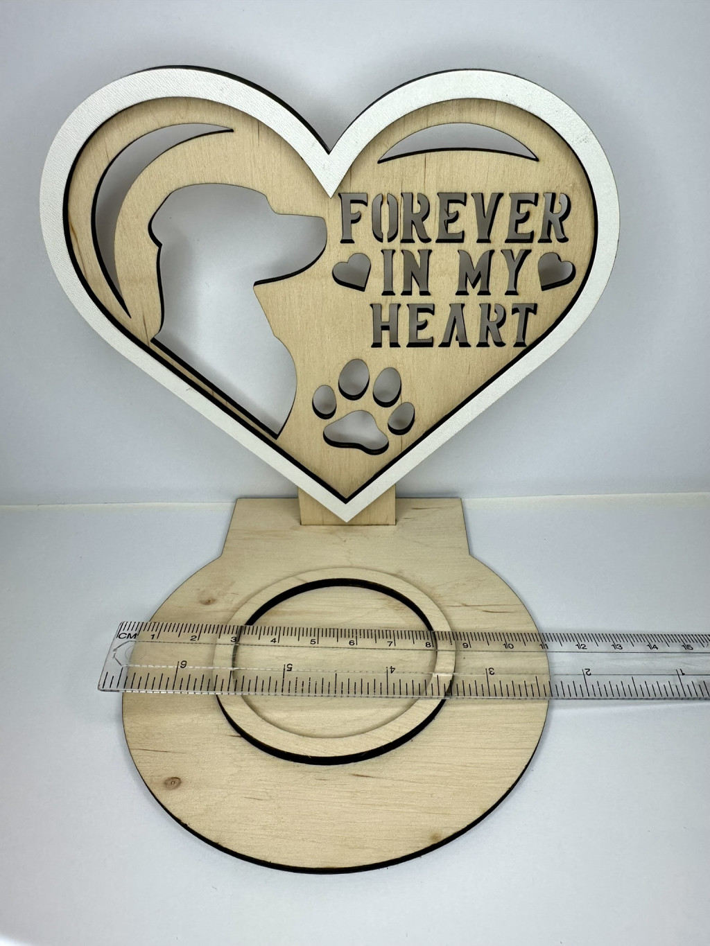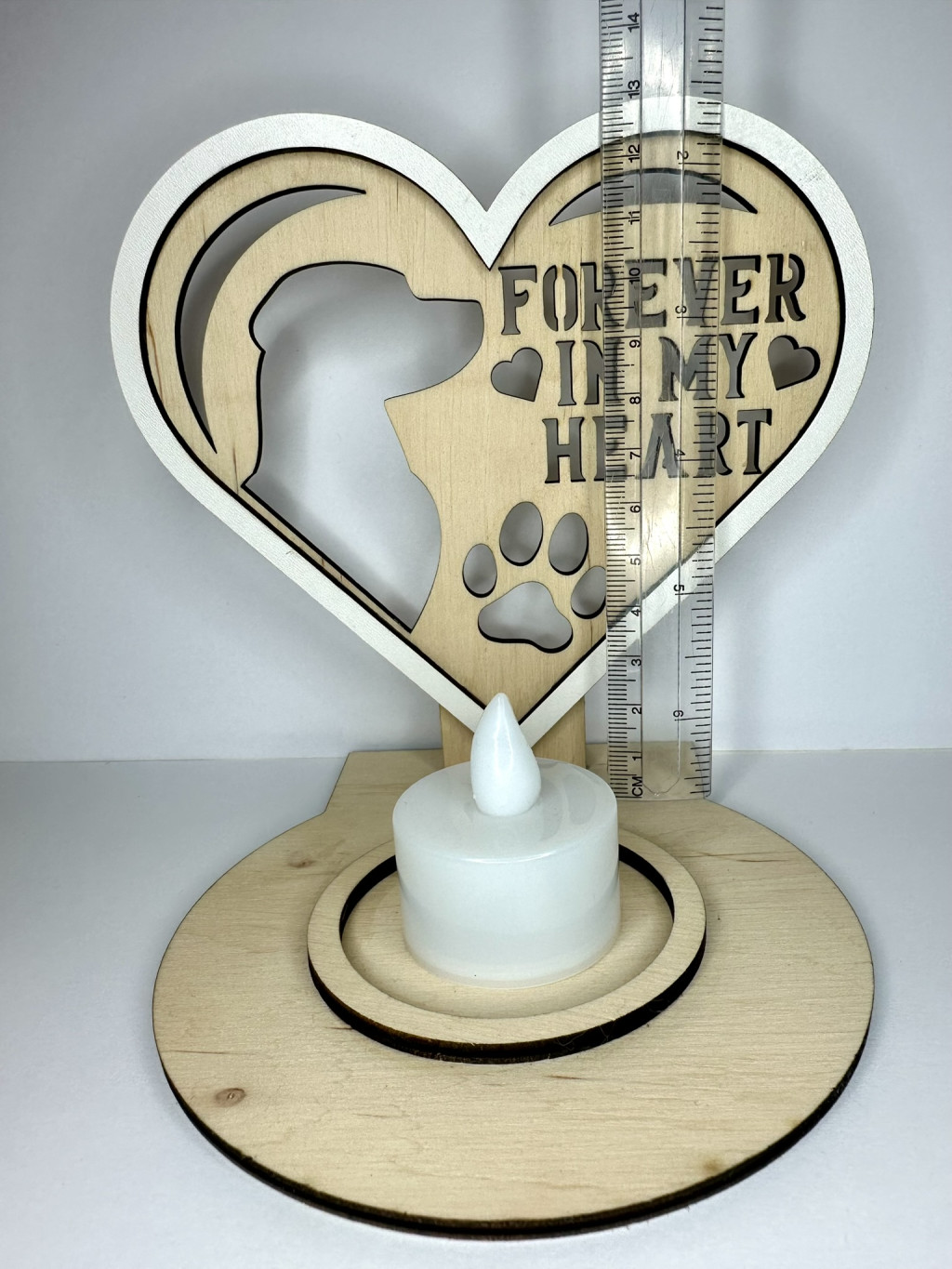Őrizd meg kedvenced emlékét méltó módon ezzel a különleges, lézervágott fa mécsestartóval. A szív alakú keretben kutya sziluett és a megható „Forever in My Heart” felirat kapott helyet, így minden pillantás emlékeztet a közös szeretetre és hűségre.
