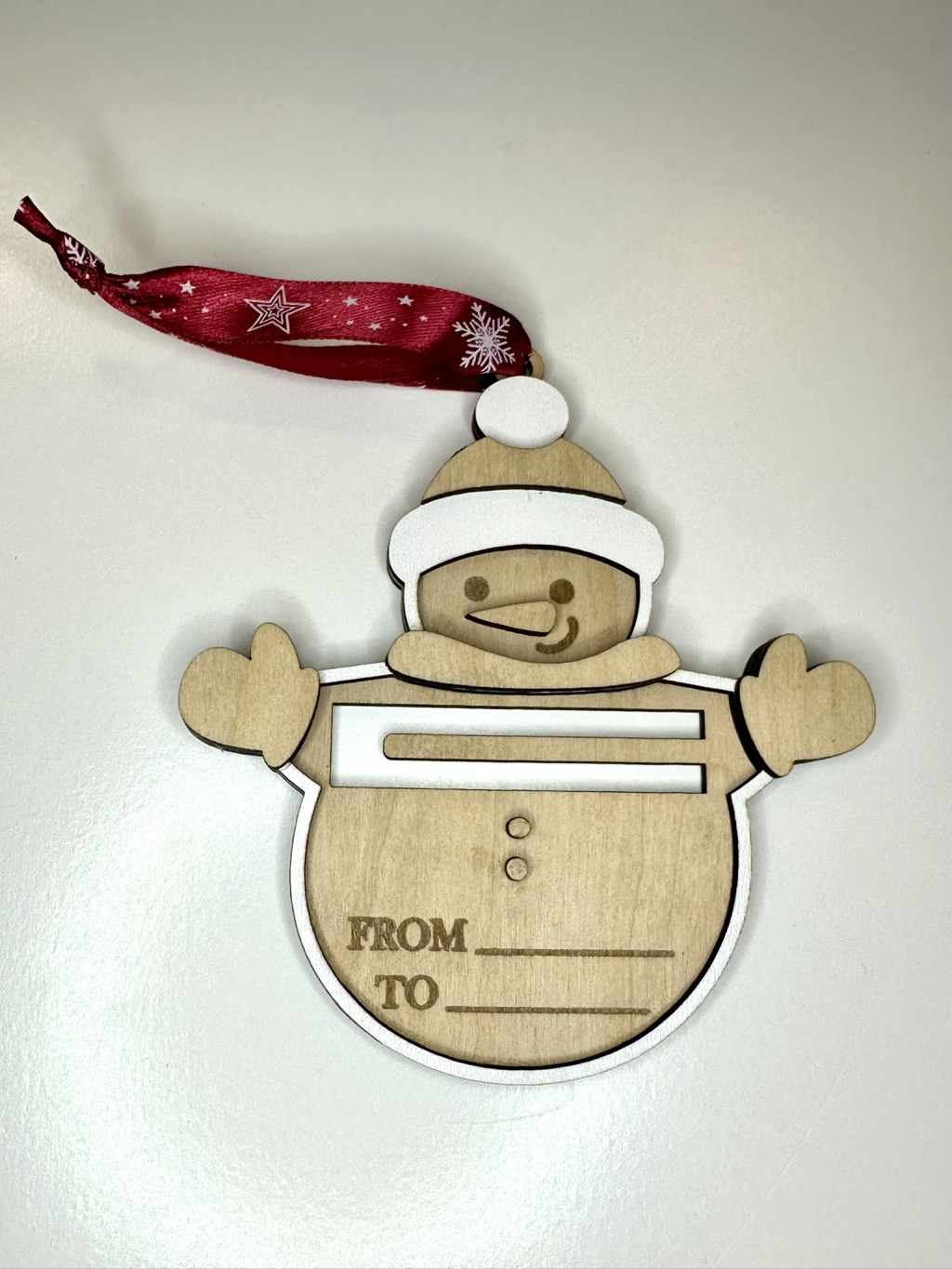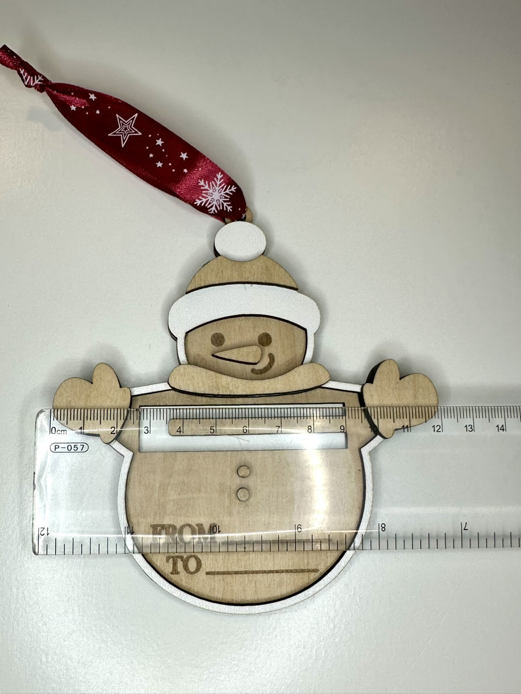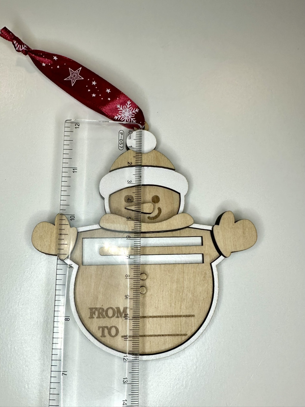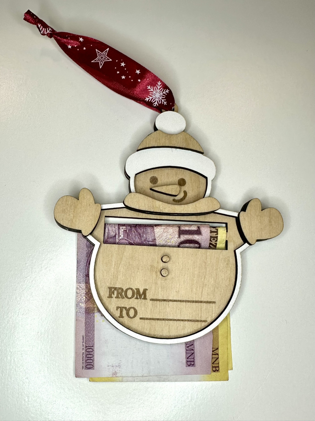A Hóember Ajándékozó egy különleges, lézervágott fa karácsonyi dísz, amely nemcsak dekoráció, hanem egy ötletes ajándékozási megoldás is. A hátoldalán kialakított zseb tökéletesen elrejti a pénzt, ajándékkártyát vagy kedves üzenetet, így a meglepetés átadása igazán egyedi élmény lesz.
