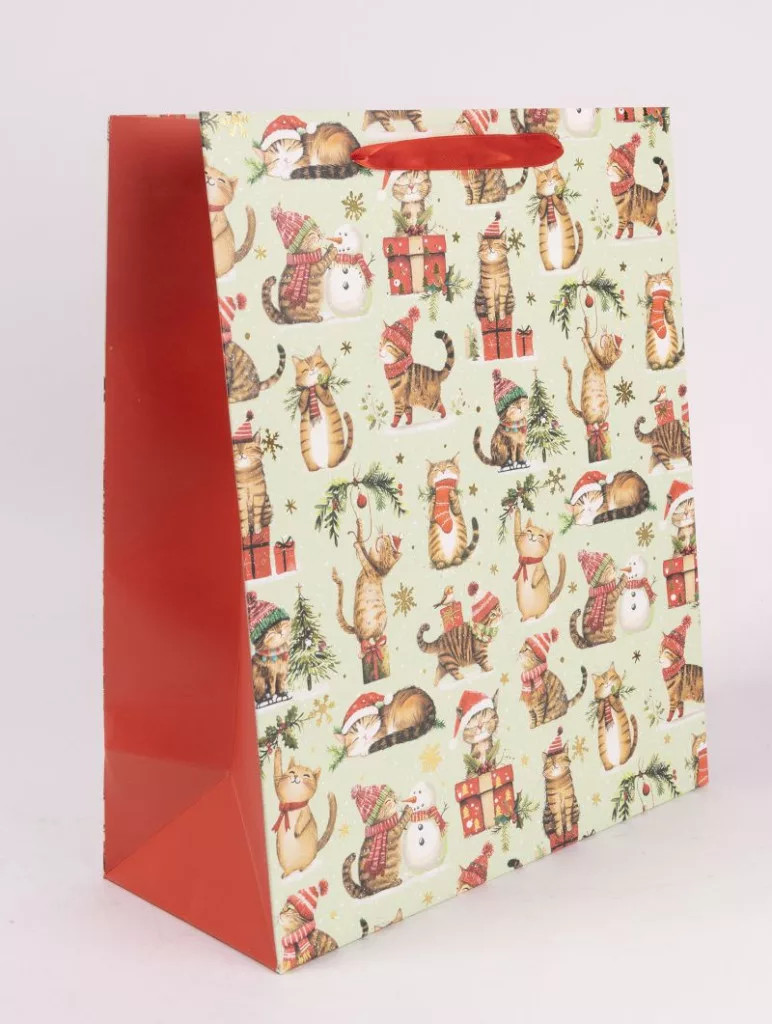 Ez a bájos, karácsonyi cicákkal díszített ajándéktáska garantáltan elrabolja minden állatbarát szívét! A táska elején és hátulján játékos, ünnepi hangulatú macskák láthatók, puha zöldes alapon – a piros oldalfalak pedig még ünnepibb megjelenést adnak neki.