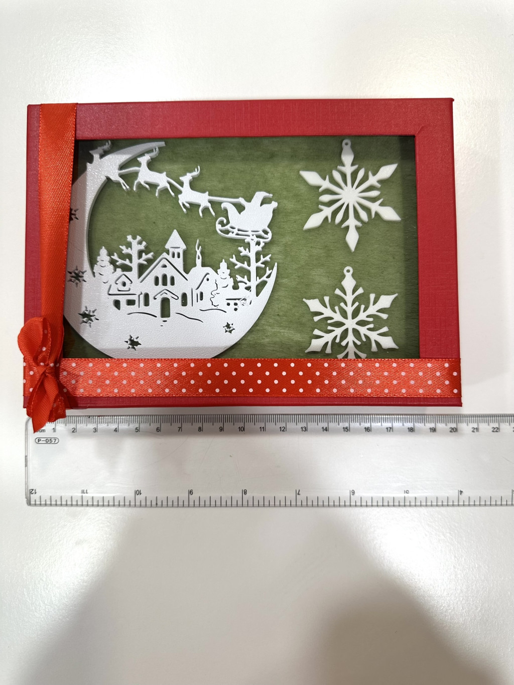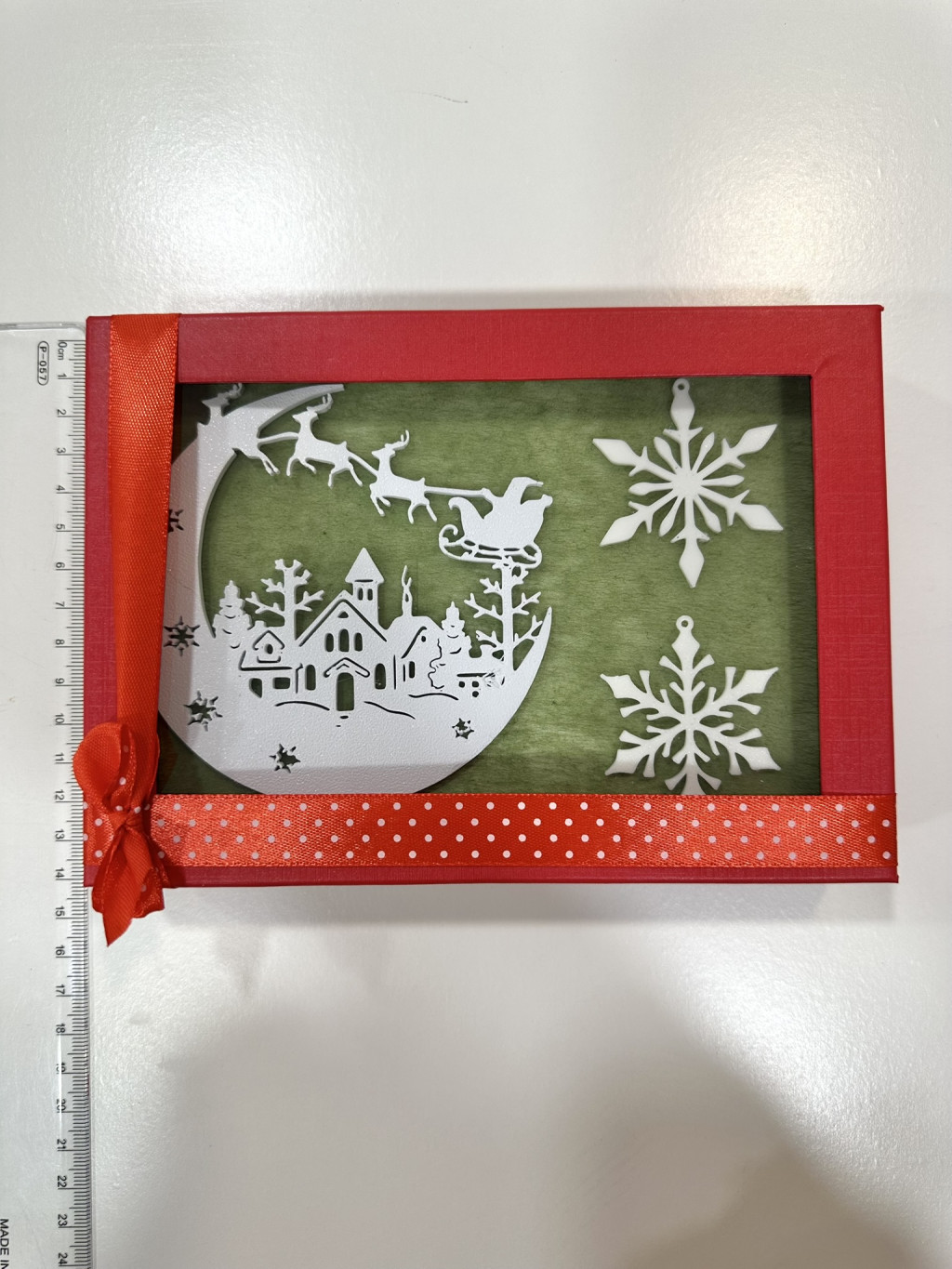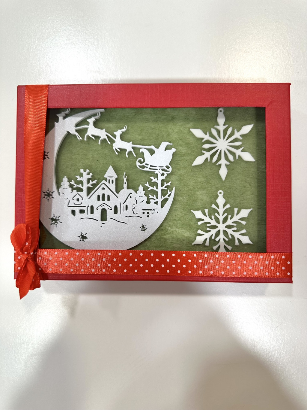 A zöld háttér és a piros masni meleg, ünnepi hangulatot áraszt, míg a doboz belsejében egy részletgazdag, 3D nyomtatott téli falu jelenik meg, a Mikulás szánjával és hópelyhekkel.