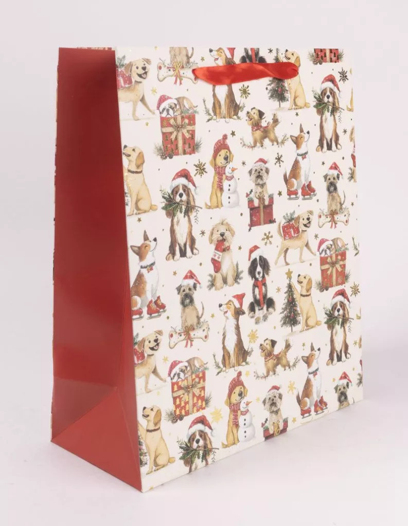 Ez a bájos, karácsonyi kutyusokkal díszített ajándéktáska igazi kedvenc lesz minden állatbarátnál! A táska elején és hátulján ünnepi minták sorakoznak: csomagolópapírba bújt kutyák, hóemberek, karácsonyi díszek és sok-sok kedves részlet. A piros oldalfalak és a piros szalagfül még ünnepibb hangulatot teremtenek.