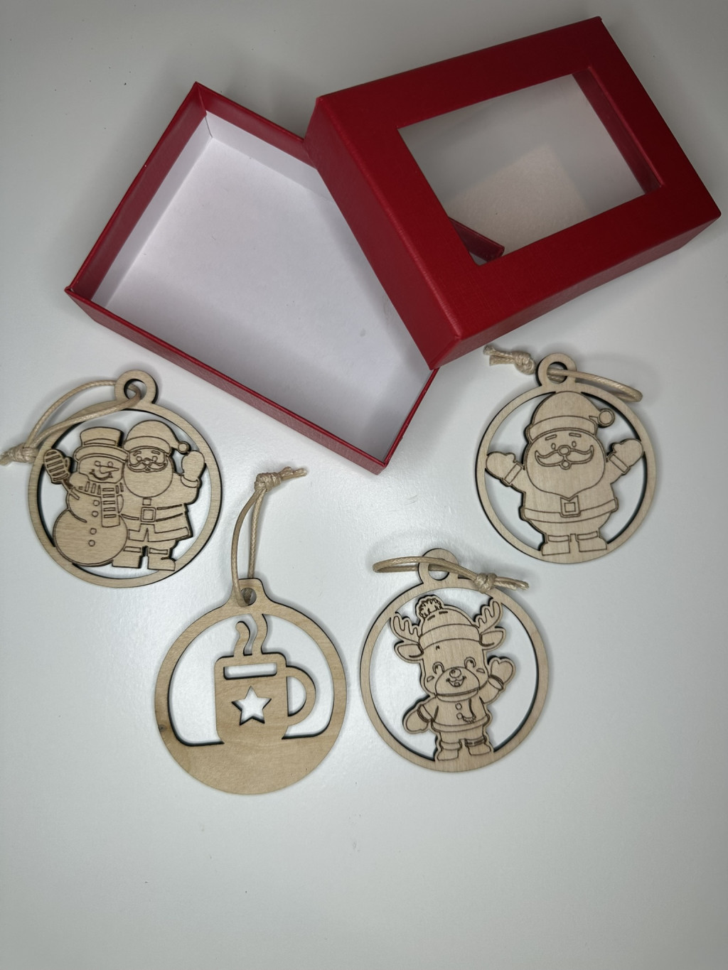 Varázsold még meghittebbé az ünnepi időszakot ezzel a gyönyörű, kézzel készült lézervágott fa karácsonyfadísz szettel! A prémium minőségű nyírfából készült díszek finom gravírozása életre kelti a négy ikonikus karácsonyi motívumot: a mosolygó Télapót, a barátságos Hóembert, a kedves kis Rénszarvast és a forró ünnepi italos bögrét.