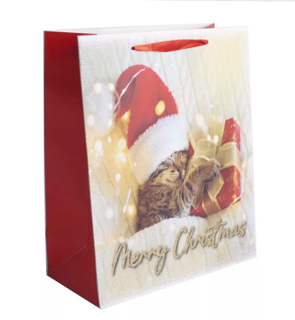 A Karácsonyi Pihepuha Cica – Ajándéktasak minden állatrajongó álma! Ez a mesés L-es méretű tasak egy alvó cicát ábrázol pihepuha karácsonyi környezetben, arany fényekkel, ünnepi sapkával és egy csillogó masnis ajándékkal. A tasak alján elhelyezett csillámos hatású „Merry Christmas” felirat igazán ünnepivé és különlegessé teszi.