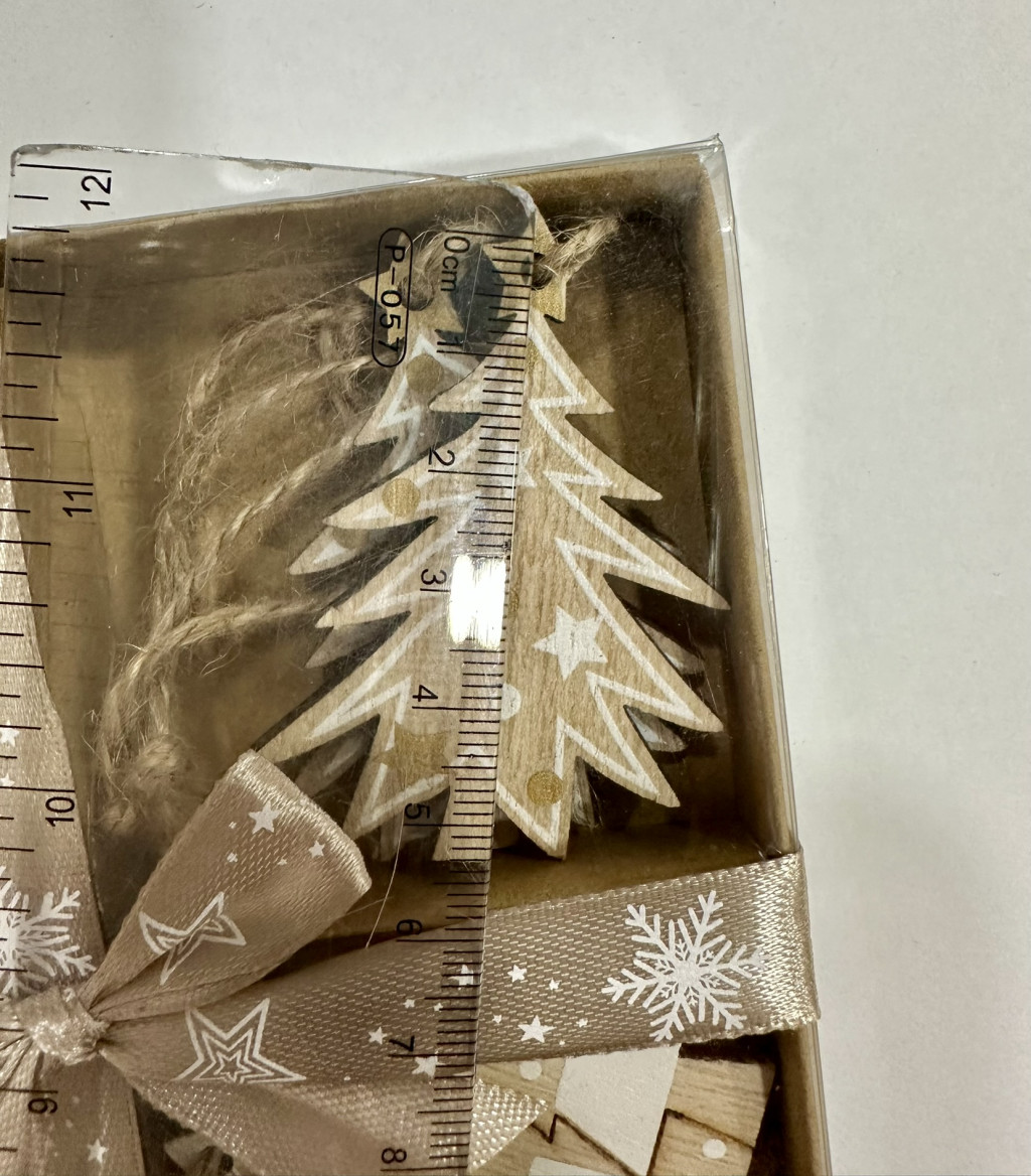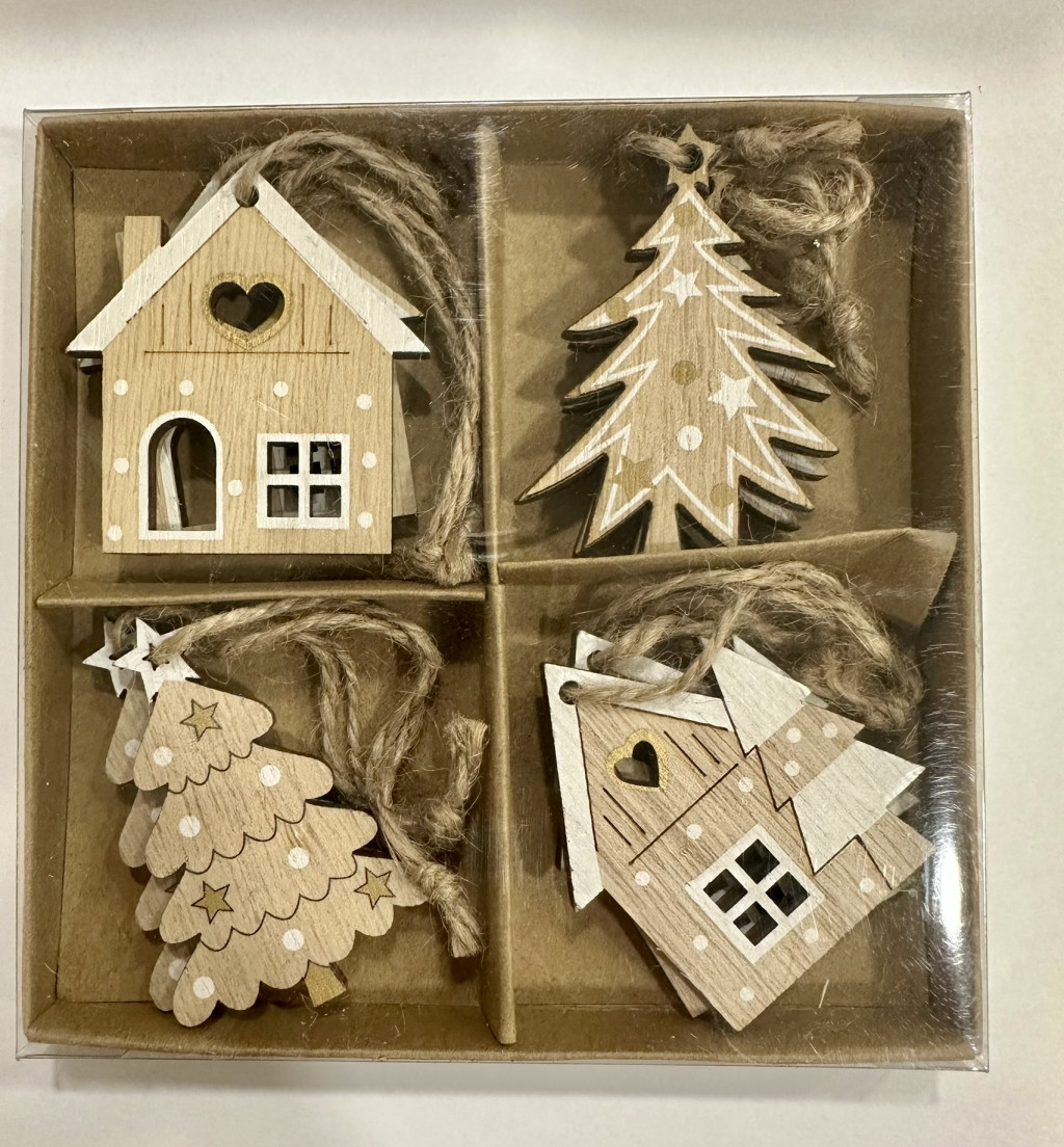 Ez a gyönyörű karácsonyi házikó és fenyő dekor szett nyolc darab natúr stílusú fa díszt tartalmaz. A dobozban négy különböző minta kapott helyet, mindegyikből két darab, így egy gazdag és változatos ünnepi csomagot kapsz.