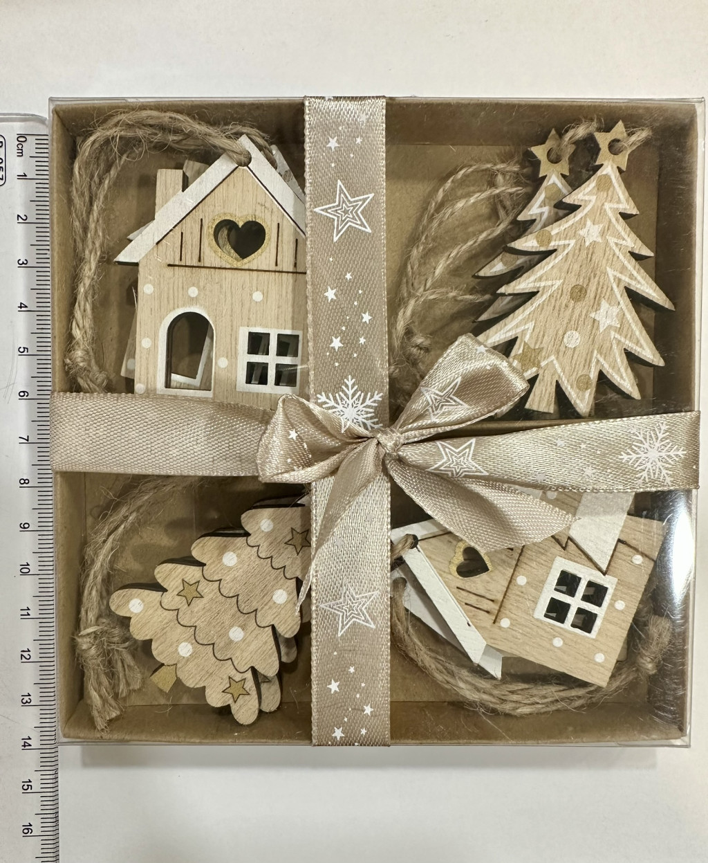 A díszek természetes fa alapból készültek és finom fehér festett mintákkal díszítettek, amelyek igazi skandináv karácsonyi hangulatot teremtenek. A rusztikus kötözőszál könnyű felhelyezést biztosít karácsonyfára, adventi dekorra, ajándékdobozra vagy akár asztaldíszre.