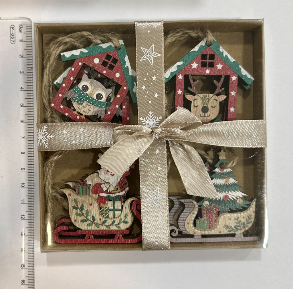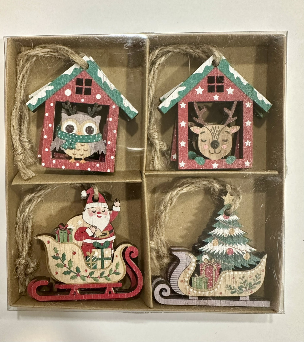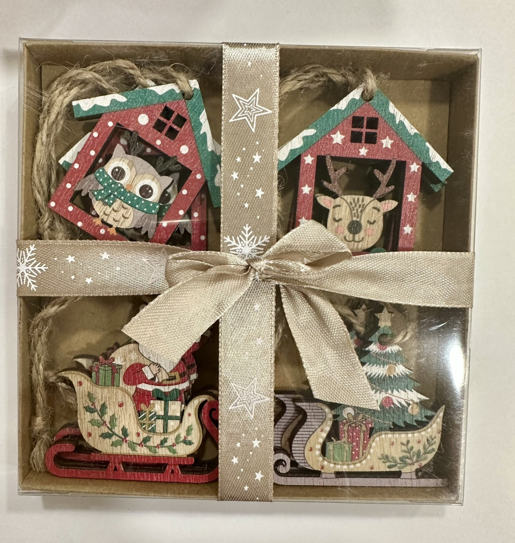 A díszek részletes festett fa alapból készültek, amelyek kedves téli hangulatot árasztanak. A szettben megtalálható a piros tetős házikó aranyos bagollyal, a mosolygó rénszarvas, a klasszikus mikulás szánnal és a karácsonyfával díszített havas szán is.