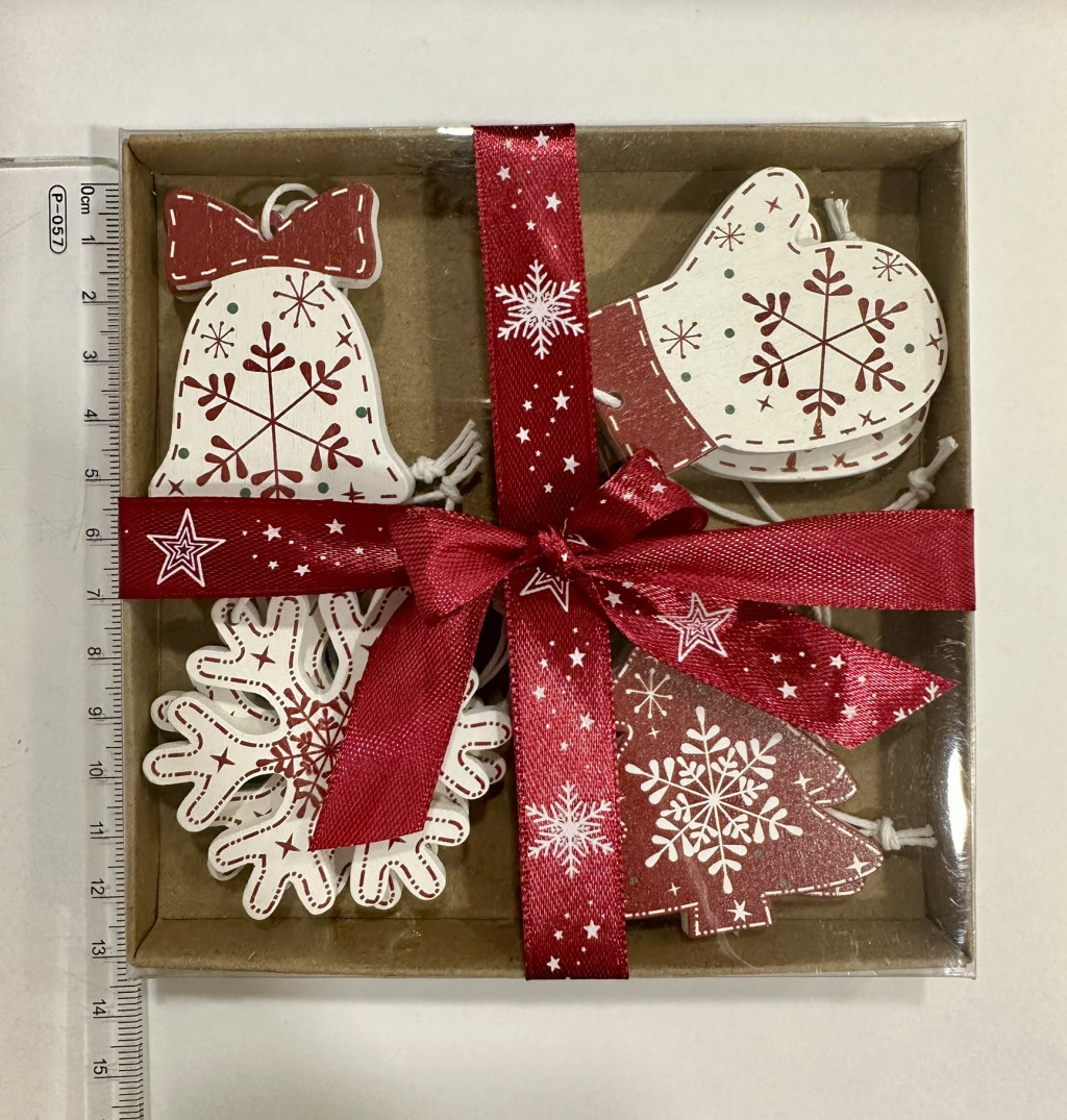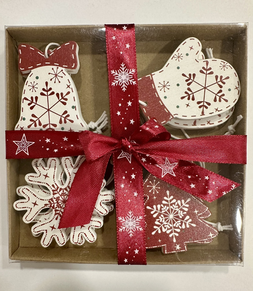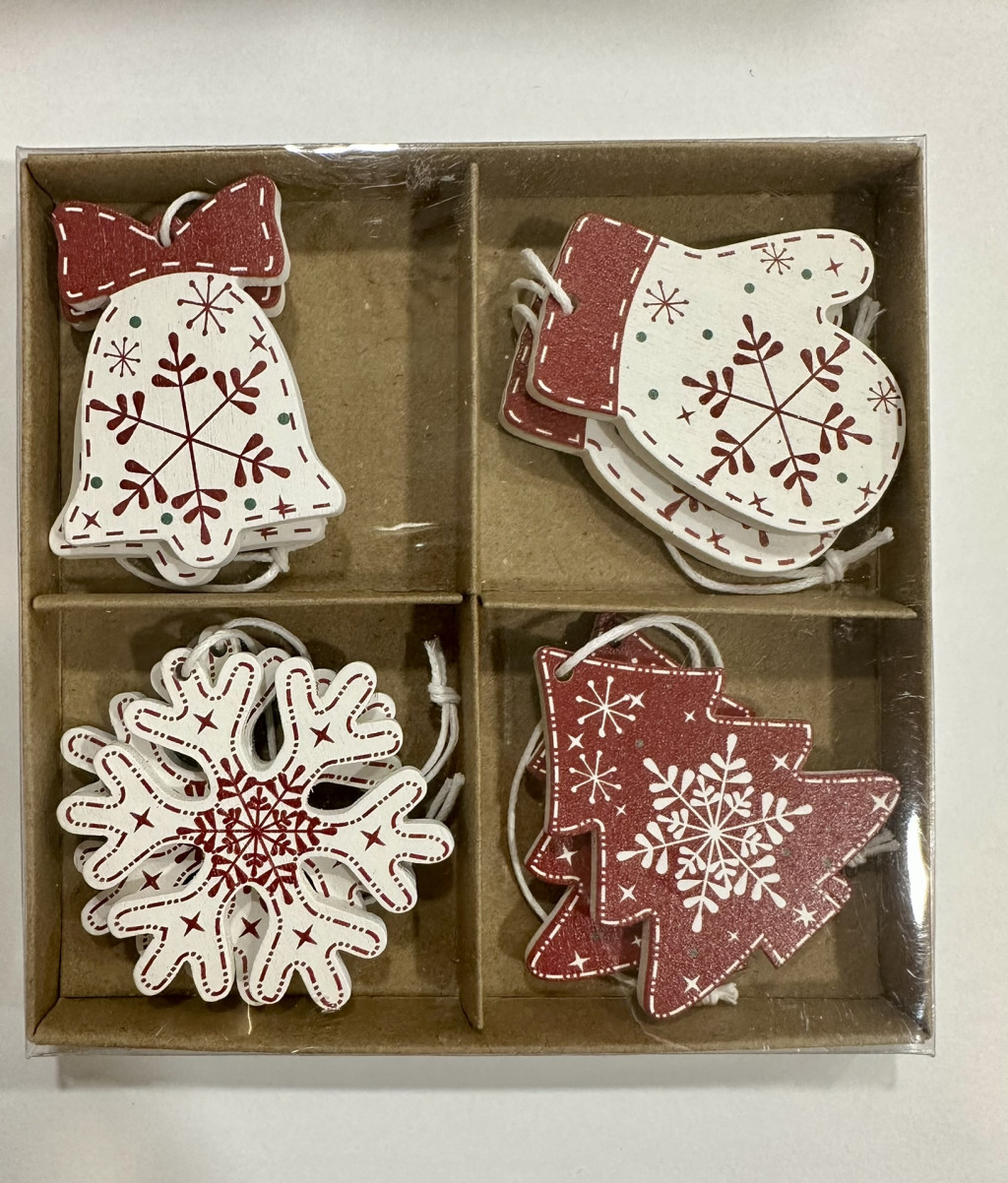 Ez a gyönyörű karácsonyi skandináv dekor szett nyolc darab piros fehér mintás fa díszt tartalmaz. A dobozban négyféle forma kapott helyet, mindegyikből két darab, így egy harmonikus, mégis változatos dekorcsomagot kapsz.