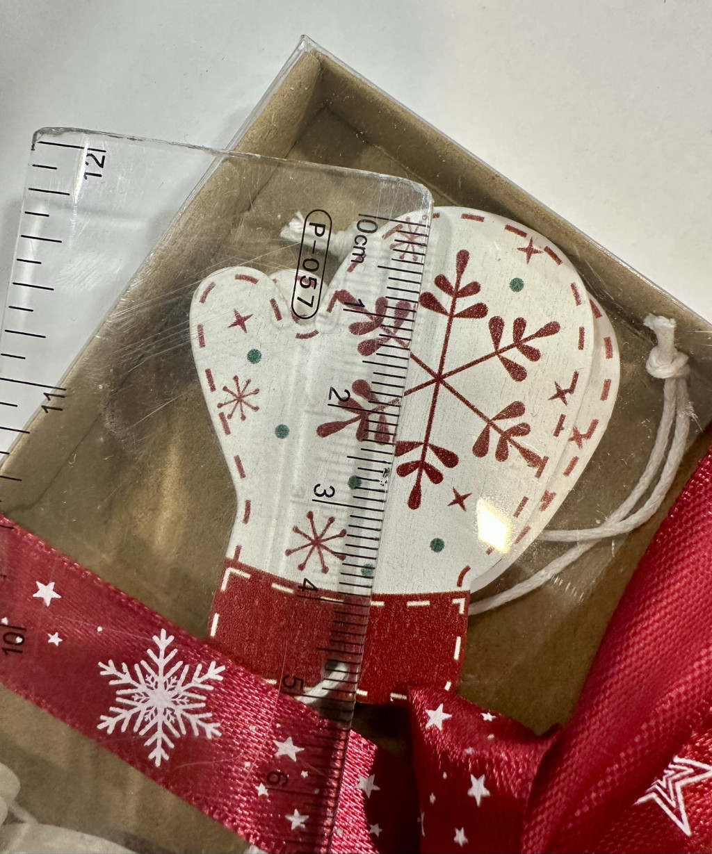A díszek természetes fa alapra készültek, finom téli motívumokkal, mint a hópehely, a csengő, a kesztyű és a fenyőfa. Ezek a minták a skandináv karácsony jellegzetes hangulatát idézik, amely egyszerre letisztult, meleg és hangulatos.