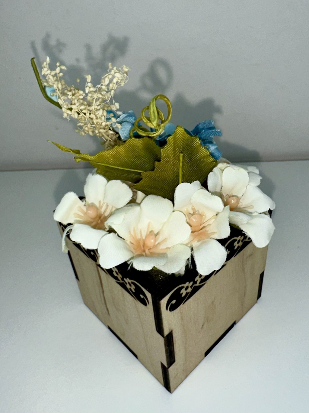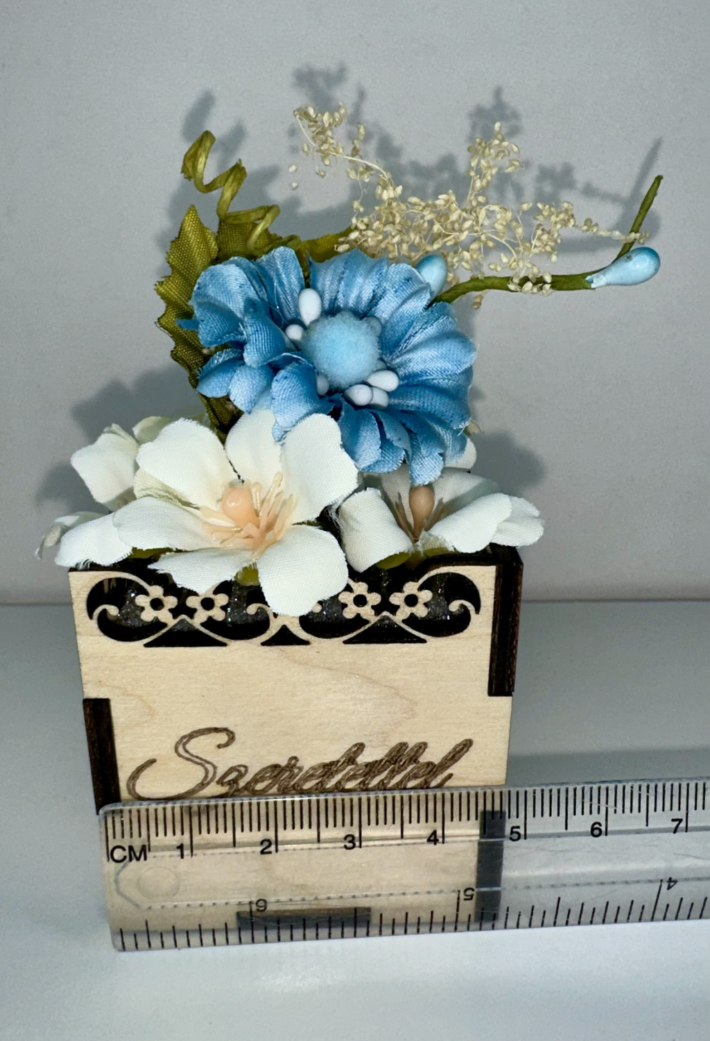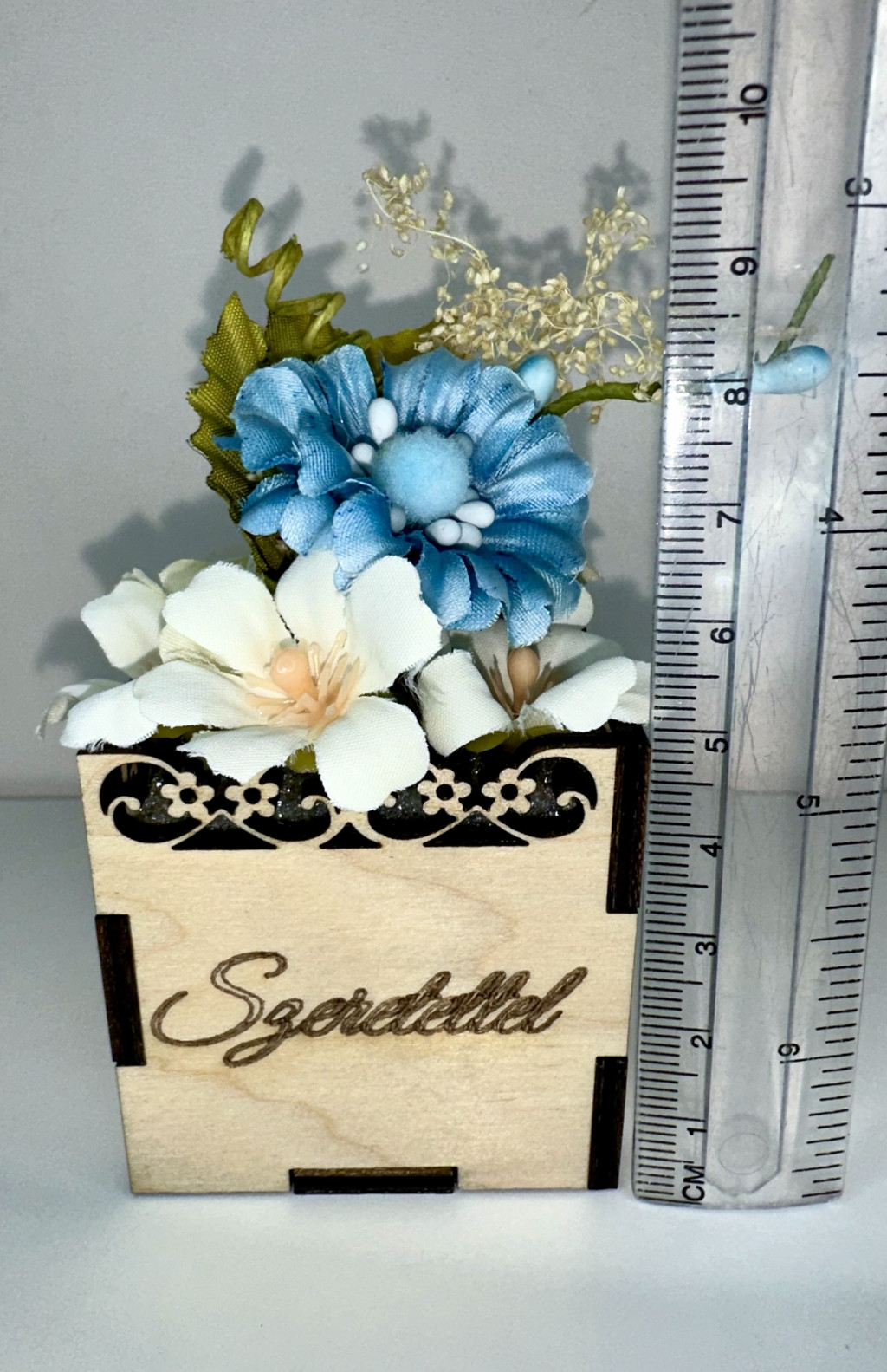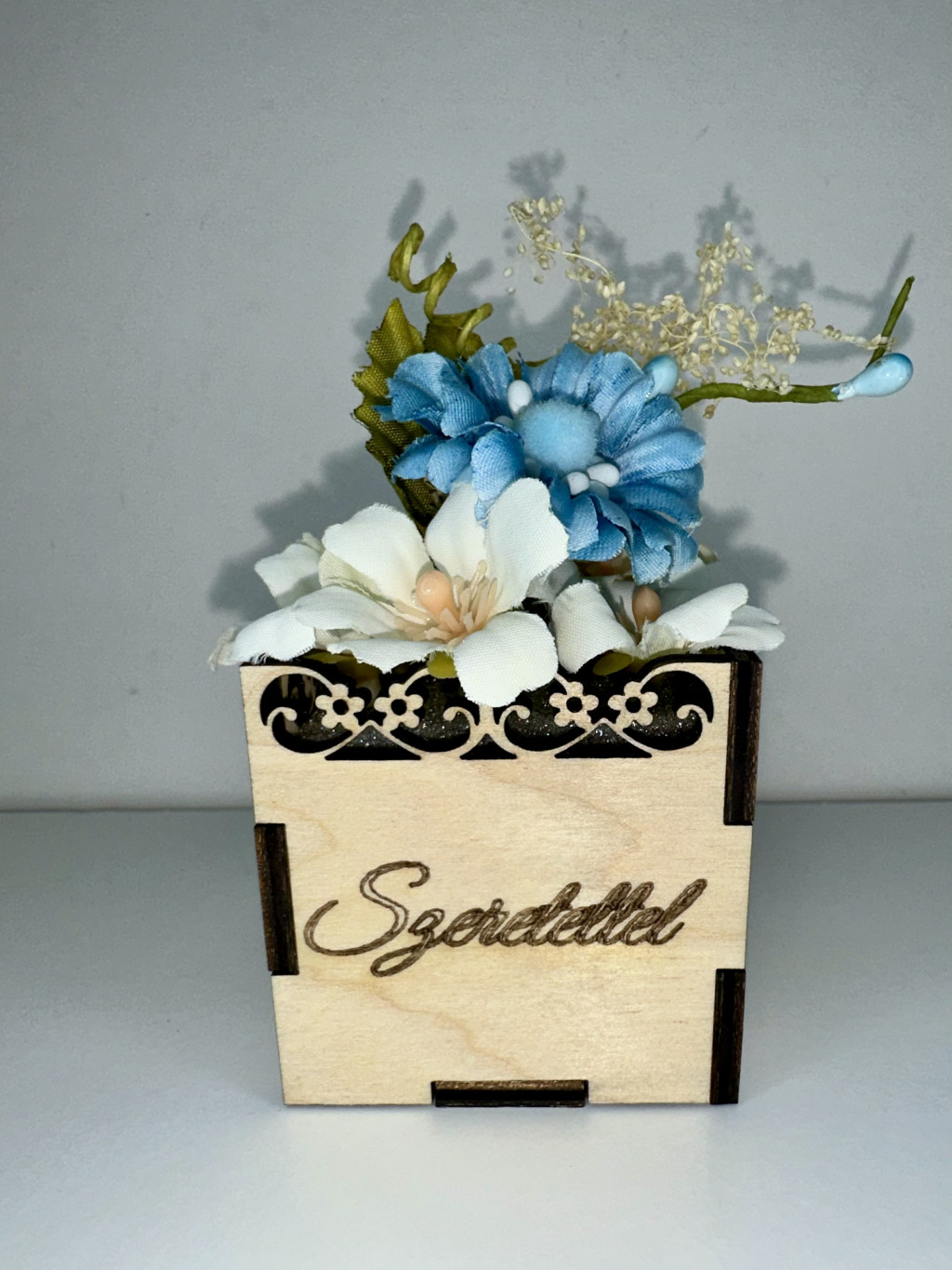 Ez a kék-fehér árnyalatú virágbox gravírozott „Szeretettel” feliratú fa díszdobozban érkezik. Hűvös, elegáns színvilága miatt modern otthonokban és irodai környezetben is tökéletesen mutat.