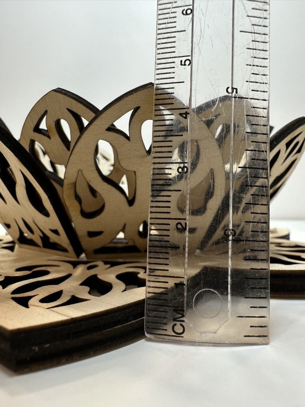 Egyedileg lézervágott faelemekből készült, amelyek lágyan visszaverik a LED mécses fényét, így varázslatos árnyékokat rajzolnak a környezetre.