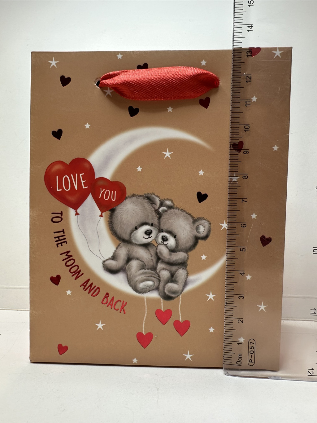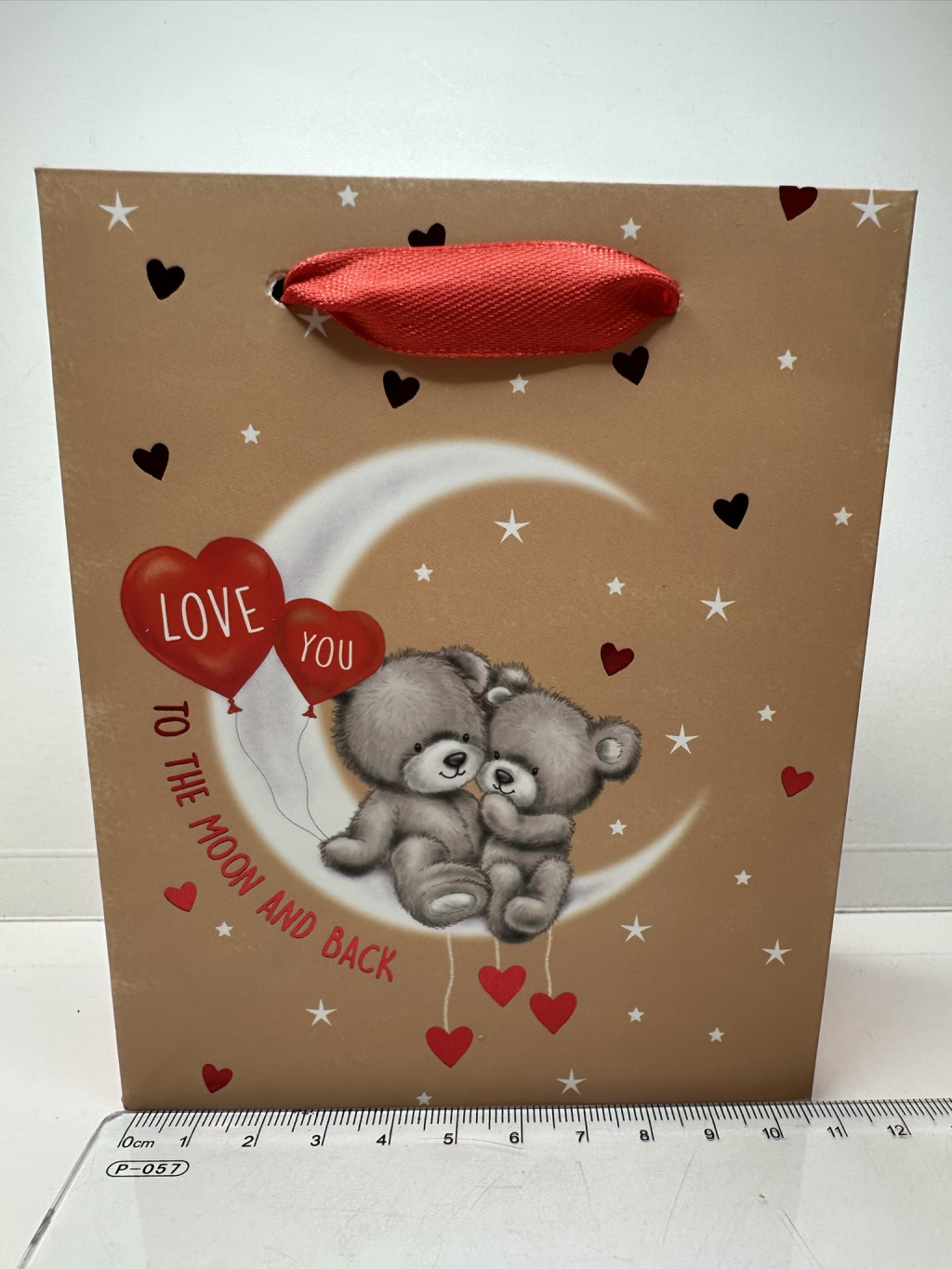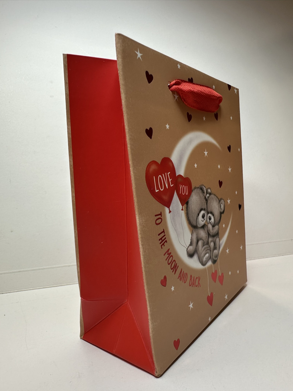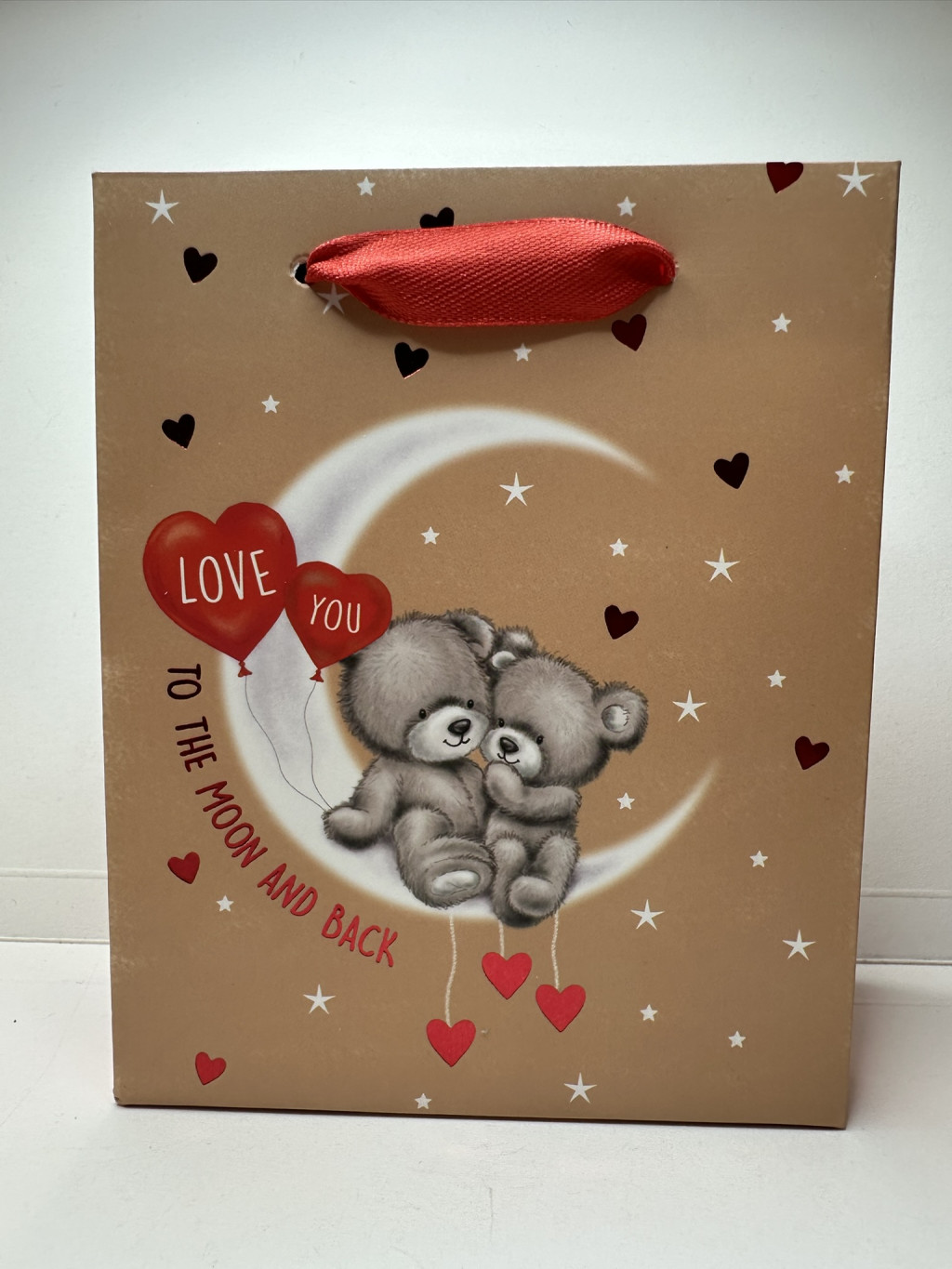 Ez a bájos, szerelmes mackópárral díszített ajándéktáska tökéletes választás bármilyen romantikus alkalomra – legyen szó évfordulóról, Valentin-napról vagy épp egy spontán meglepetésről. A bézs alapszínt csillagok és szívecskék díszítik, középen pedig két ölelkező mackó ül a holdon, piros szív alakú lufikkal, amelyeken a "LOVE YOU" felirat olvasható. Alatta az üzenet: "To the moon and back" – az örök szerelem szimbóluma.