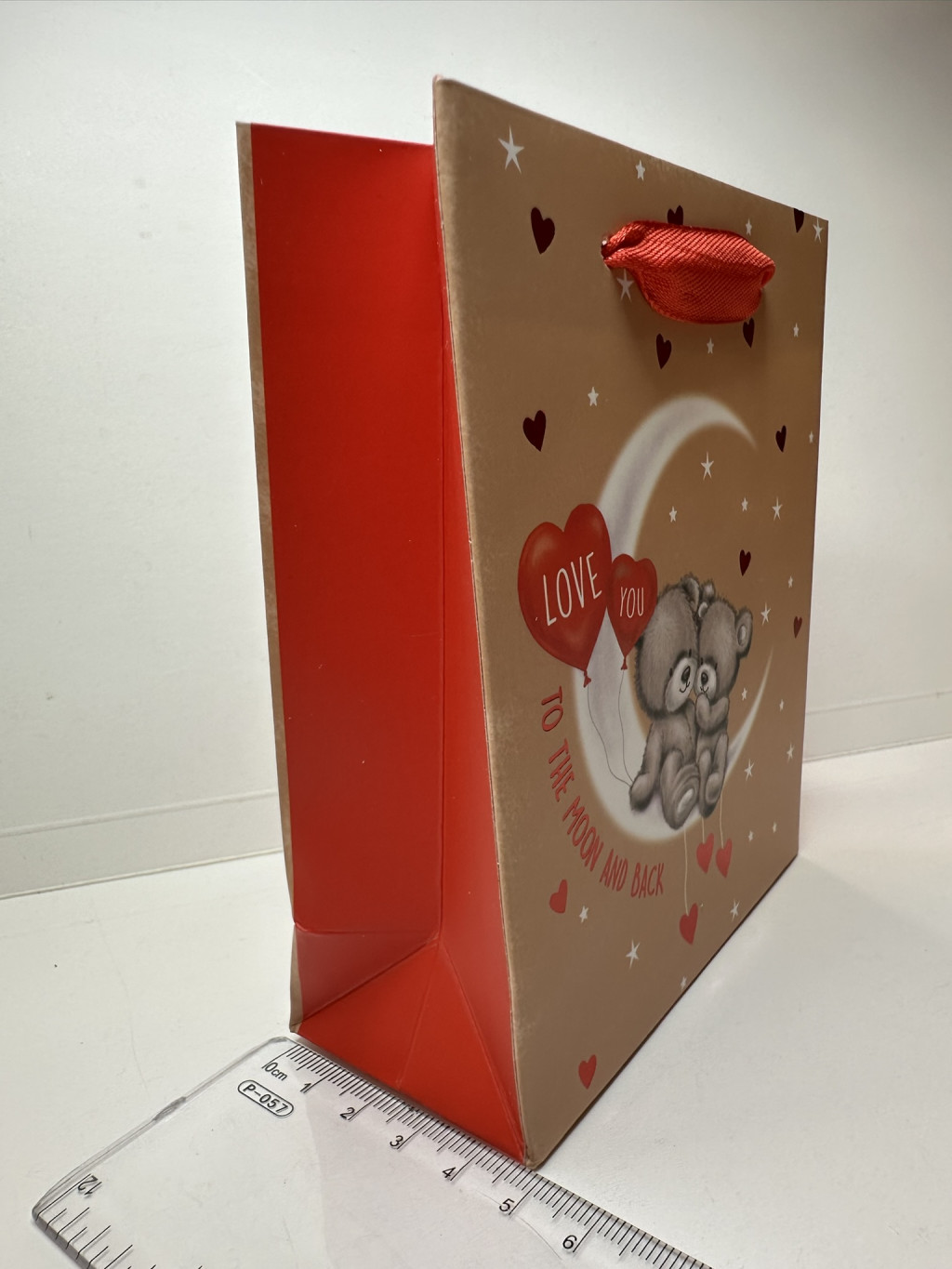 A táska oldalai élénk piros színűek, a hozzáillő piros szalagfüllel kényelmesen kézben hordható. Ideális méretű kisebb ajándékokhoz, emlékdobozhoz, könyvhöz, plüsshöz vagy egy romantikus meglepetéscsomaghoz.