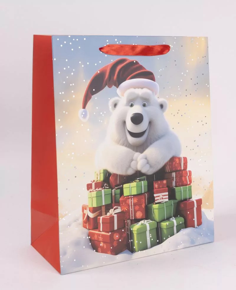 Ez a bájos, mesefigurás karácsonyi ajándéktáska azonnal mosolyt csal bárki arcára. A középen ülő, Mikulássapkás jegesmedve és a köré tornyozott piros–zöld ajándékcsomagok igazi ünnepi hangulatot teremtenek. A piros oldalfal és a hozzá illő piros szaténszalag fül tovább erősíti az ünnepi összehatást.