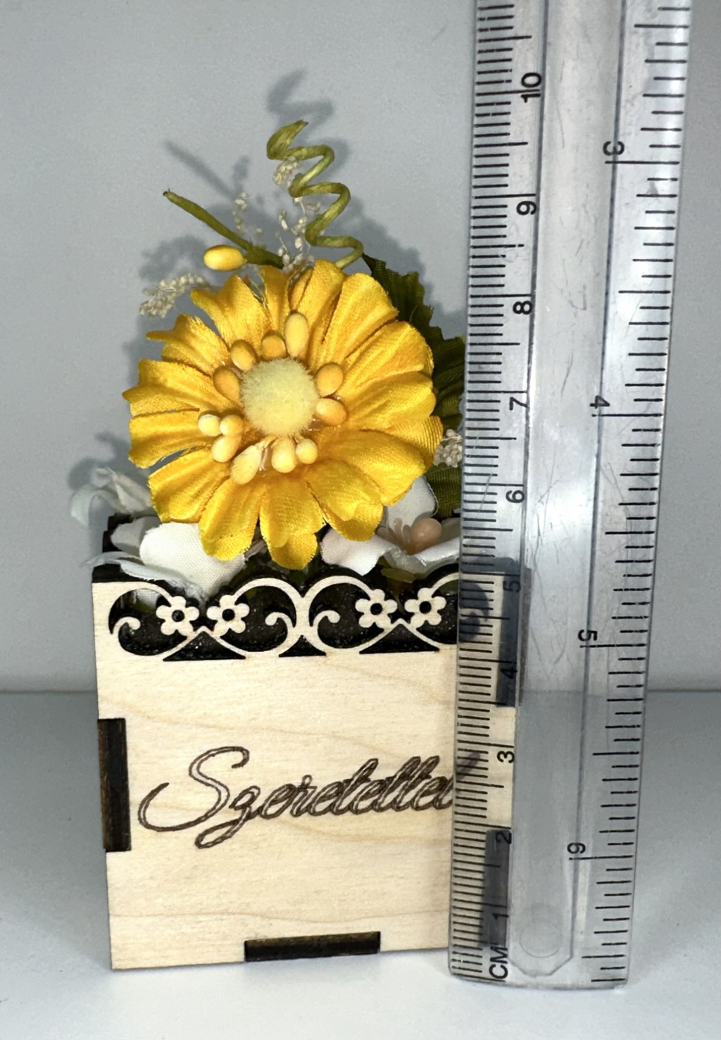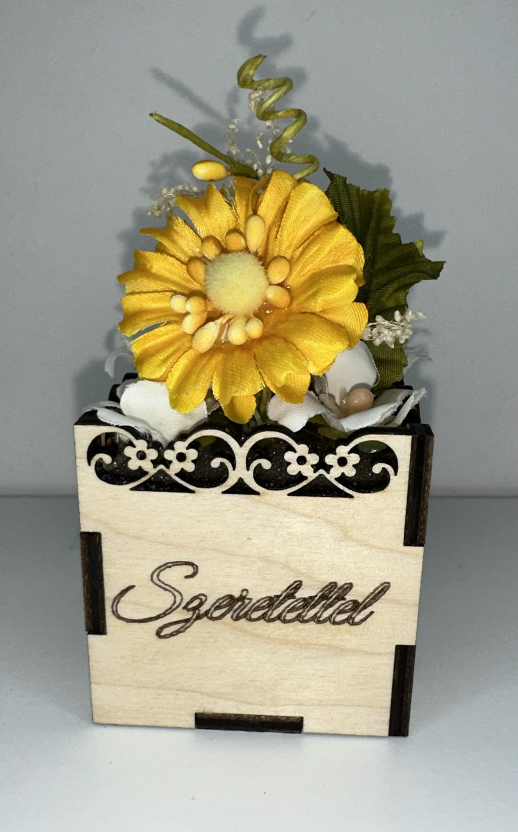 Ez a sárga margaréta virágbox gravírozott „Szeretettel” feliratú fa díszdobozban érkezik, így nemcsak dekoráció, hanem személyes üzenetet is közvetít.