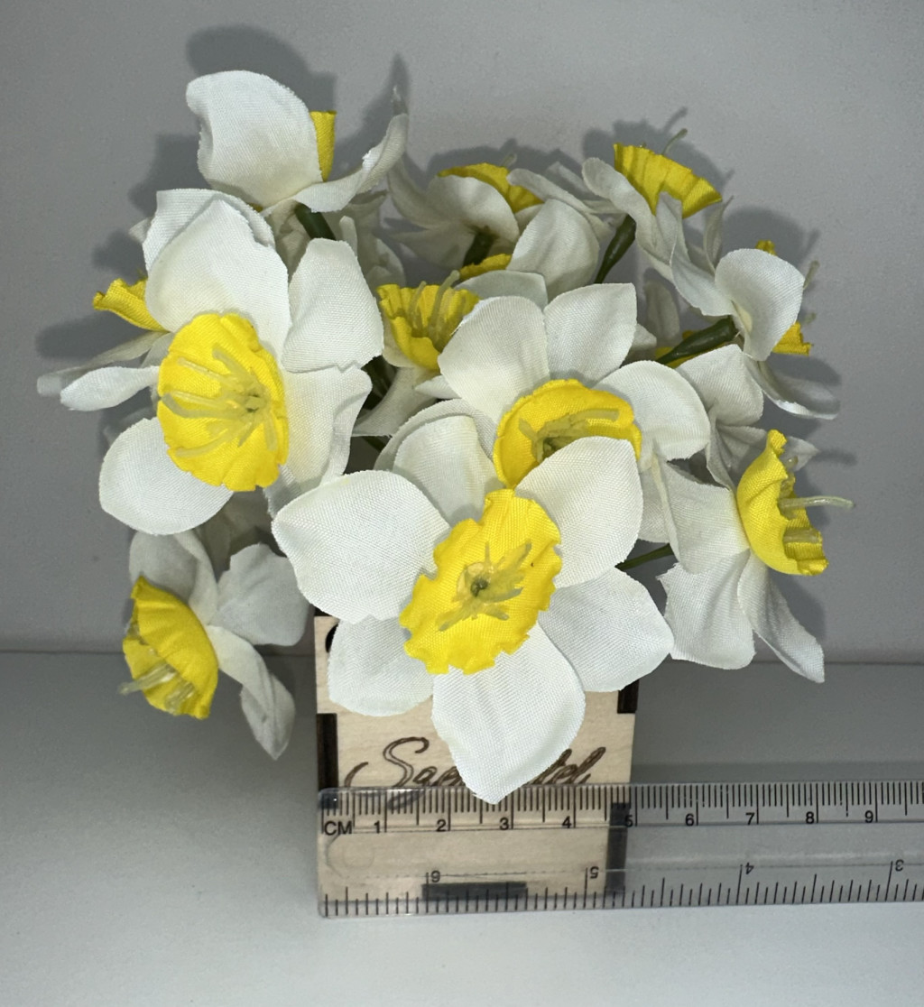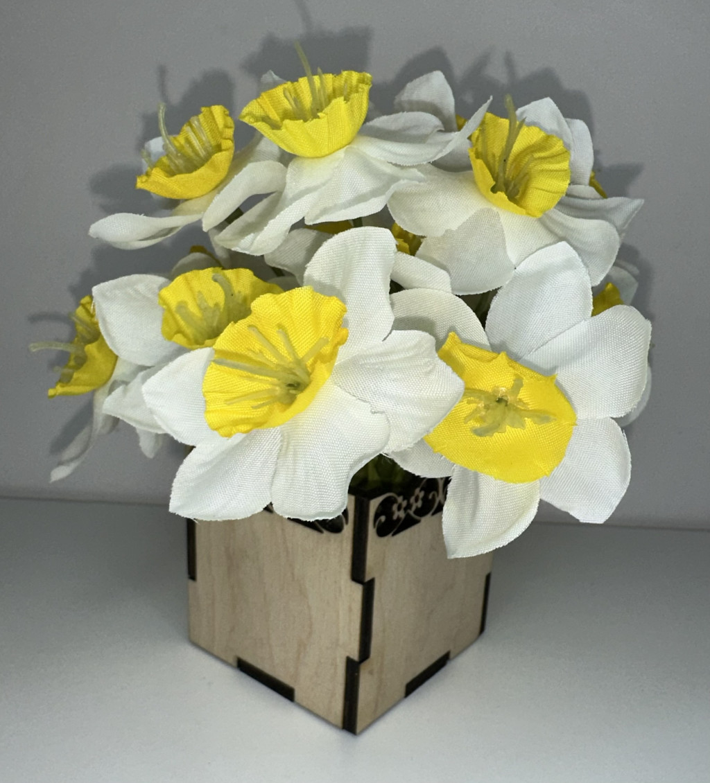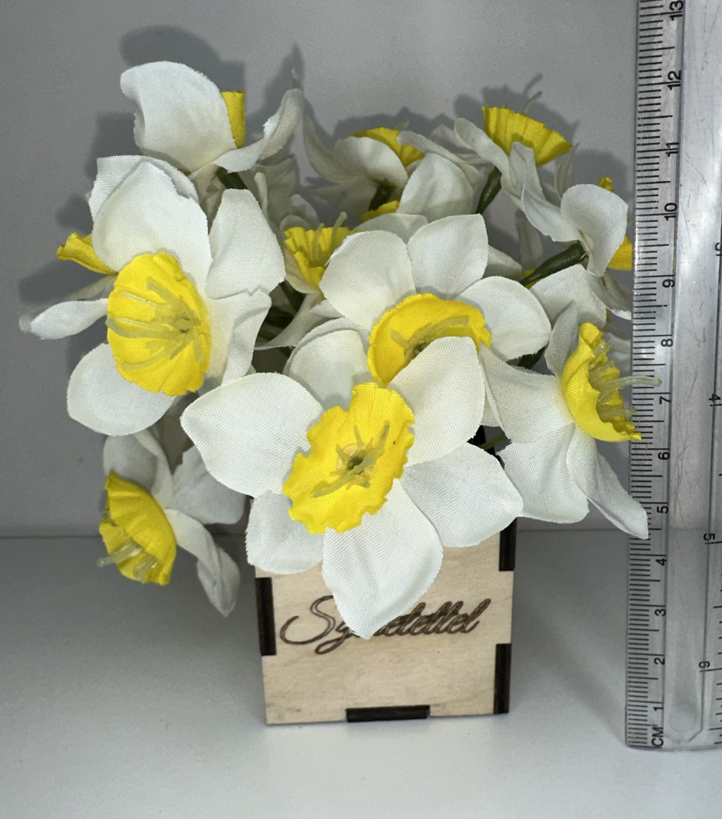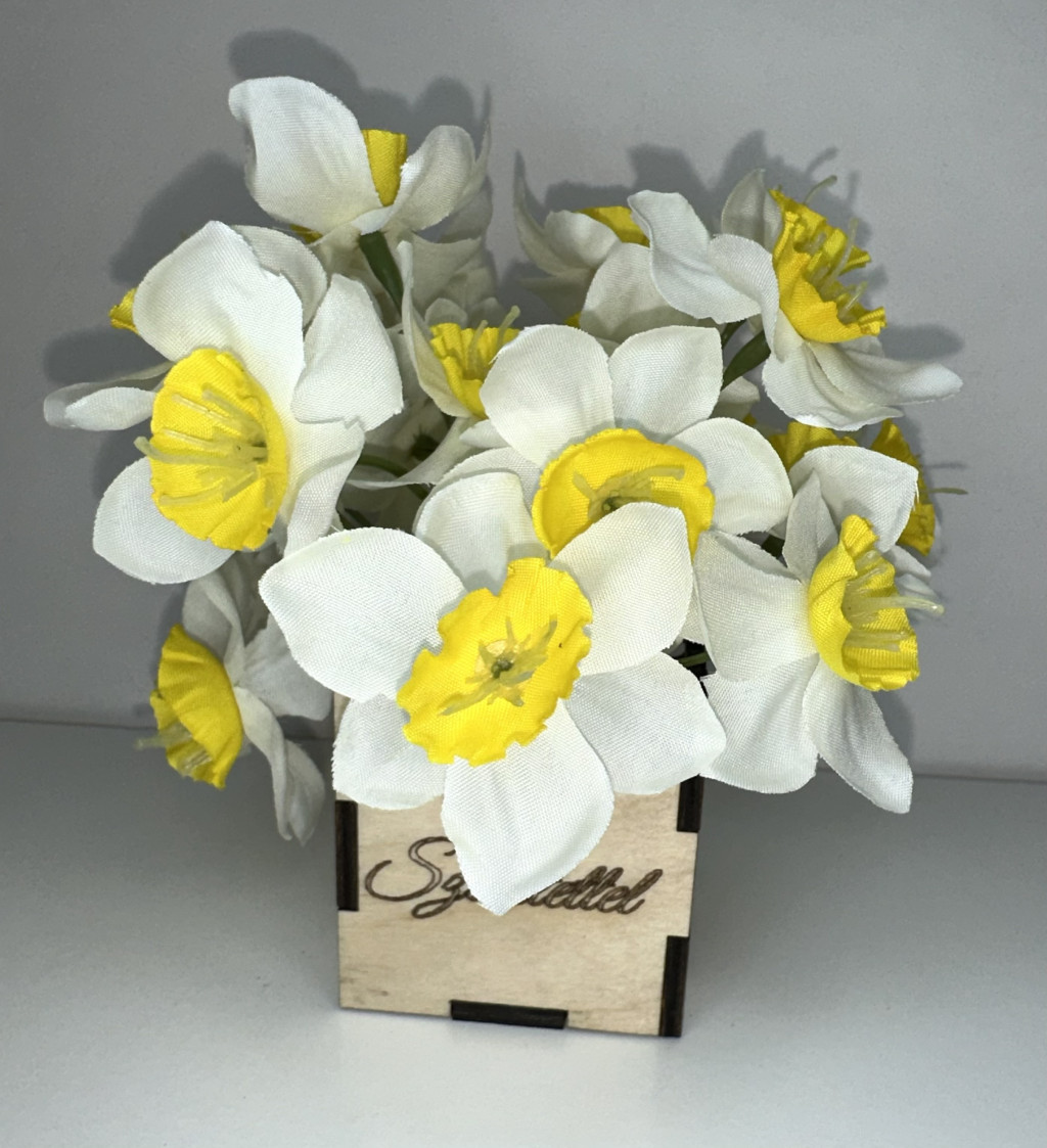 Ez a fehér-sárga nárciszcsokor elegáns, gravírozott „Szeretettel” feliratú fa díszdobozban érkezik, így nemcsak dekoráció, hanem valódi ajándék is.