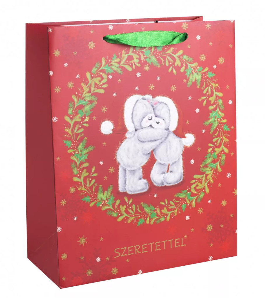 Az Ölelő Macik – Szeretettel Ajándéktasak melegséget, kedvességet és igazi ünnepi hangulatot áraszt. Piros alapszíne karácsonyi díszítésekkel, arany hópelyhekkel és egy kedvesen ölelkező macipárral teszi különlegessé. A „SZERETETTEL” felirat még személyesebbé varázsolja, így tökéletes választás családtagoknak, barátoknak vagy meghitt ajándékok átadásához.