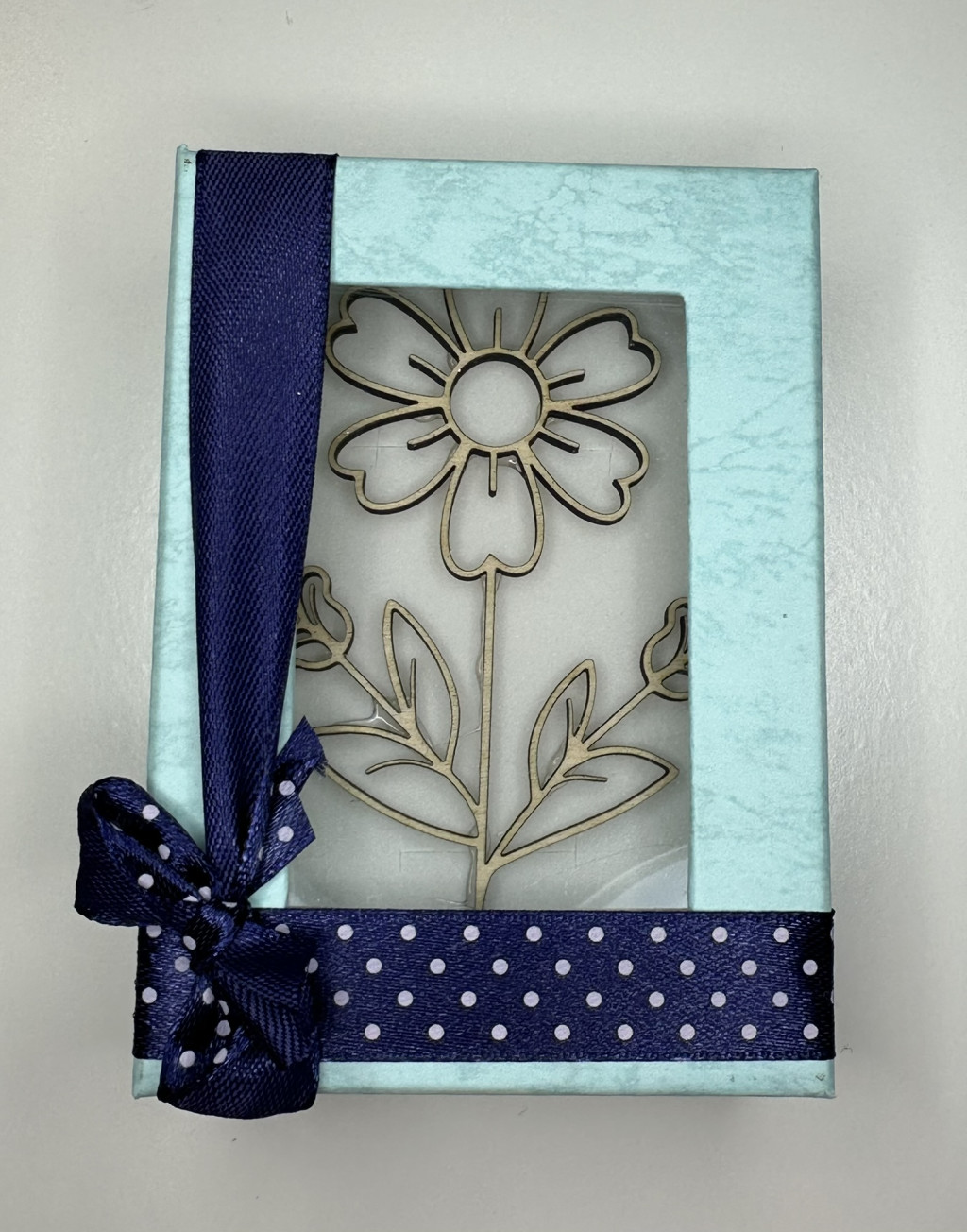 A világoskék, textúrált díszdoboz friss, könnyed megjelenést ad, a pöttyös szalag pedig játékos, mégis igényes hatást kelt. A virágdoboz azonnal ajándékozható, nem igényel külön csomagolást.