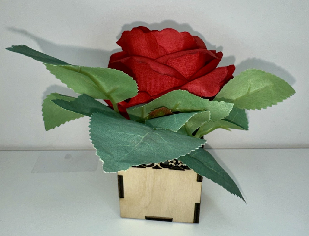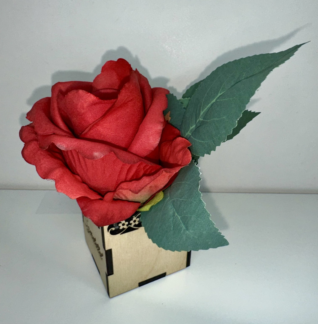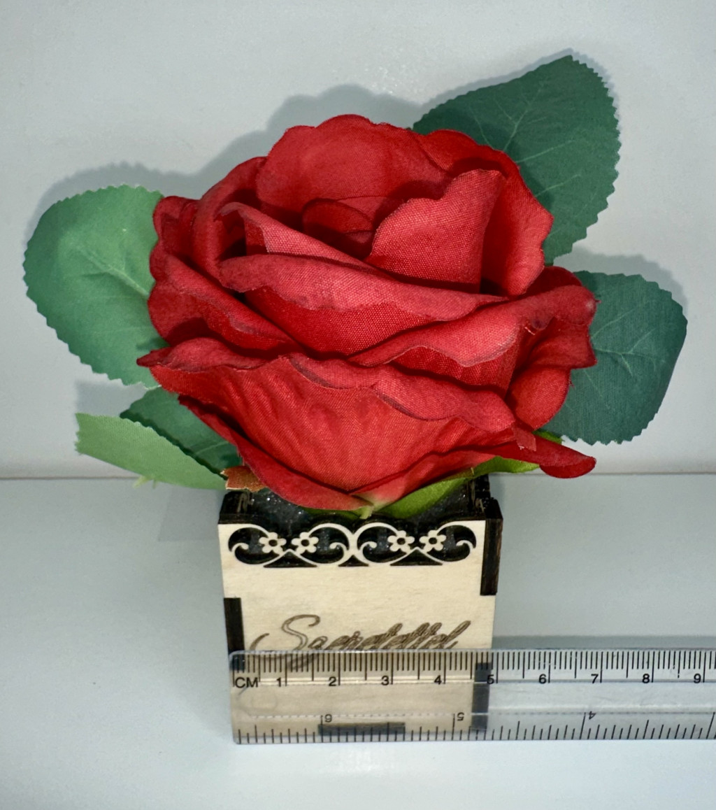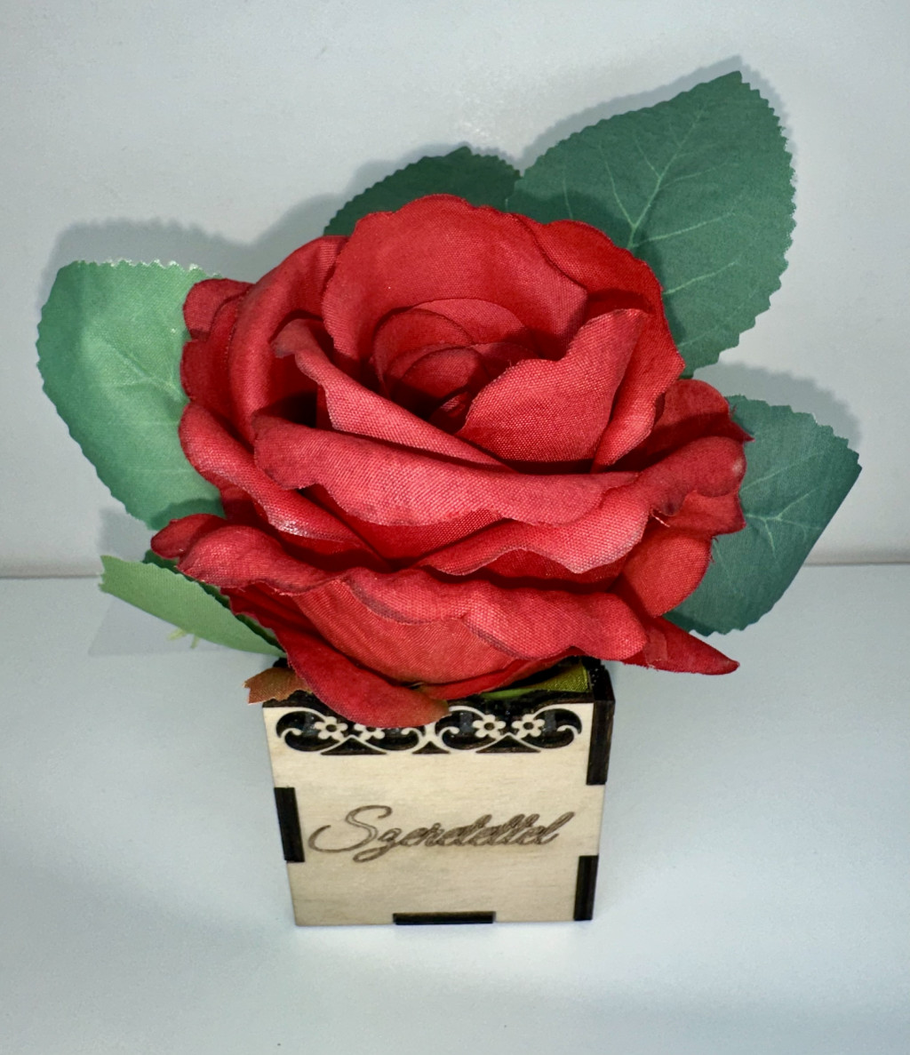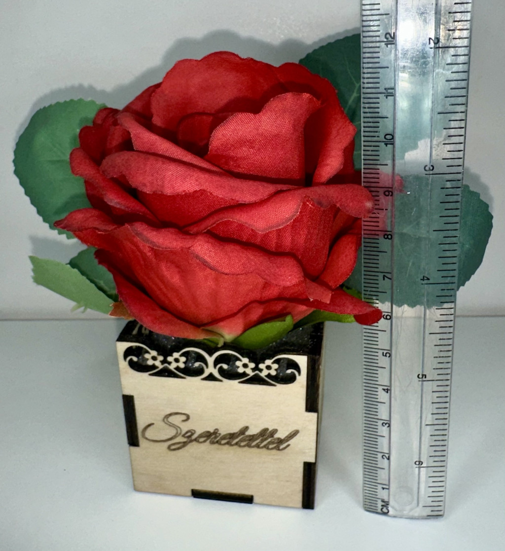 A fa doboz természetes megjelenése és a részletgazdag rózsa együtt elegáns, mégis meghitt ajándékká teszi.