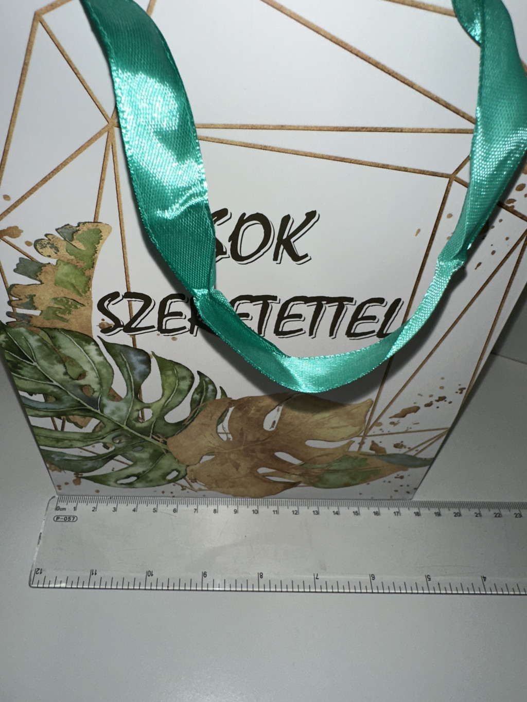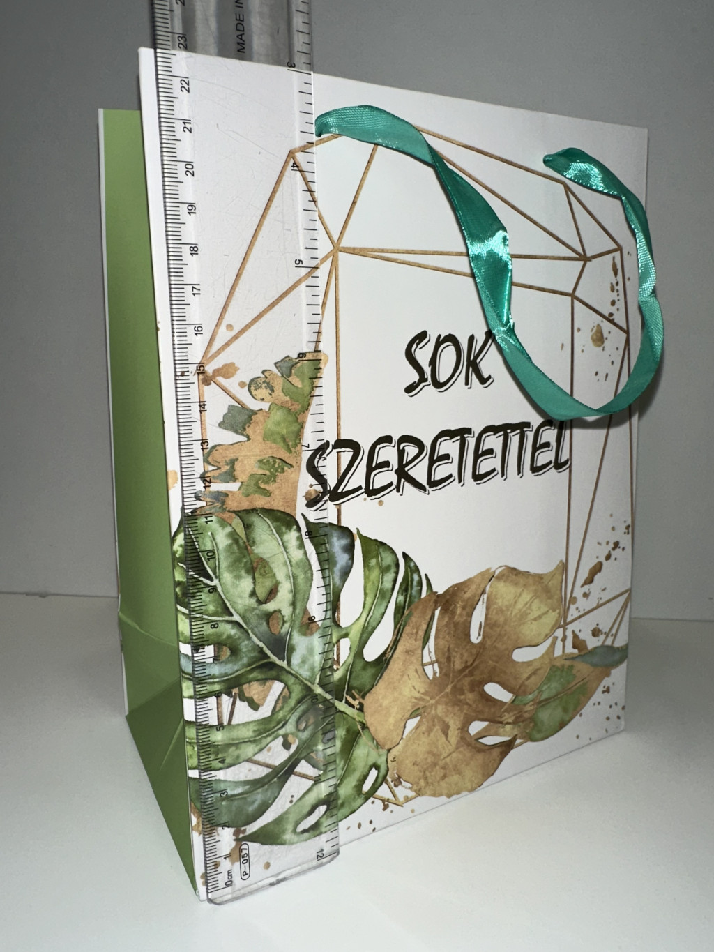 Ez a „Sok szeretettel” feliratos ajándéktáska letisztult, modern megjelenésével és elegáns zöld, levélmintás dizájnjával különleges hangulatot ad bármilyen meglepetésnek.