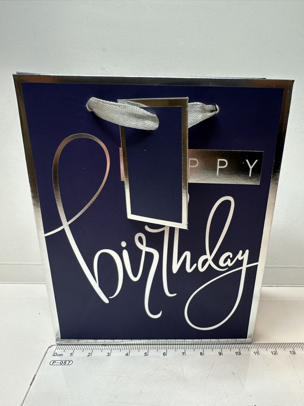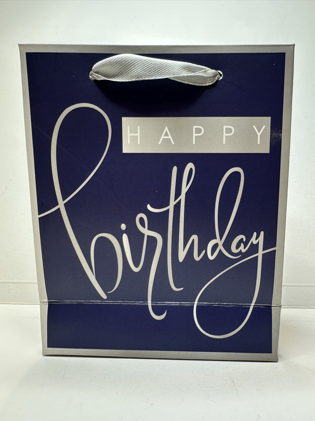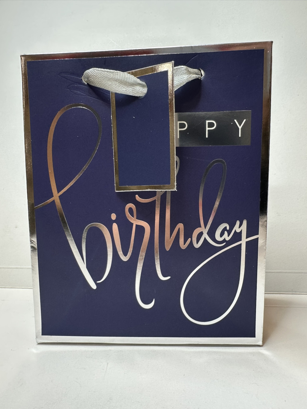 Sötétkék „Happy Birthday” ajándéktasak ezüst részletekkel