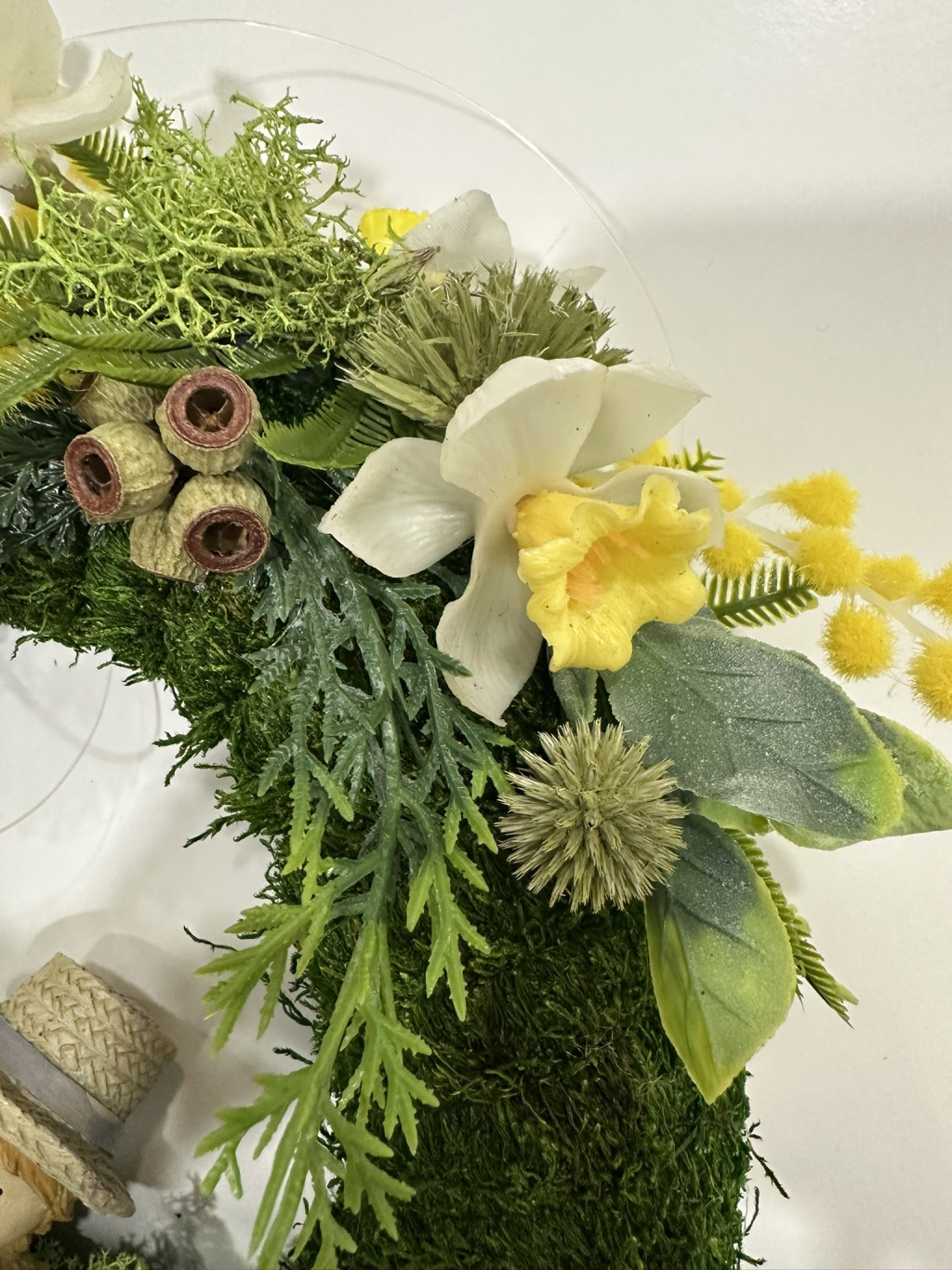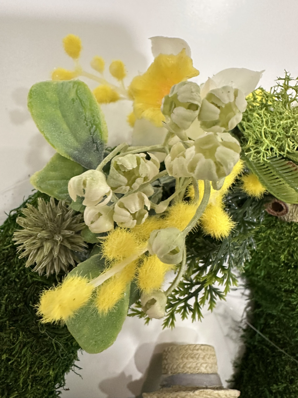 A koszorú alapját egy zöld mohahatású dekorációs alap adja, amely természetes, friss tavaszi megjelenést kölcsönöz a dekorációnak. A kompozíciót gondosan összeválogatott tavaszi virágok, sárga mimóza jellegű díszek, levelek és természetes hatású termések teszik teljessé.