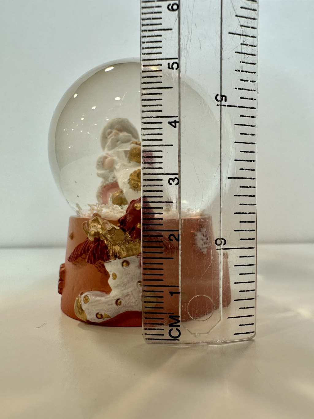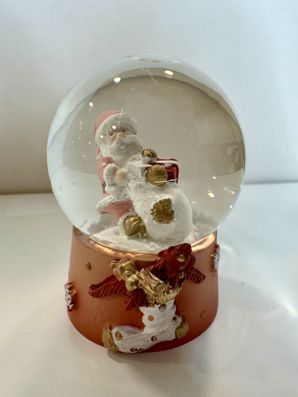 A gömbben kedves Télapó figura látható zsákkal és ajándékokkal, finoman eső „hóval”, amely csodás téli hangulatot teremt. A díszes alap arany és fehér részletei tovább emelik az ünnepi látványt.
