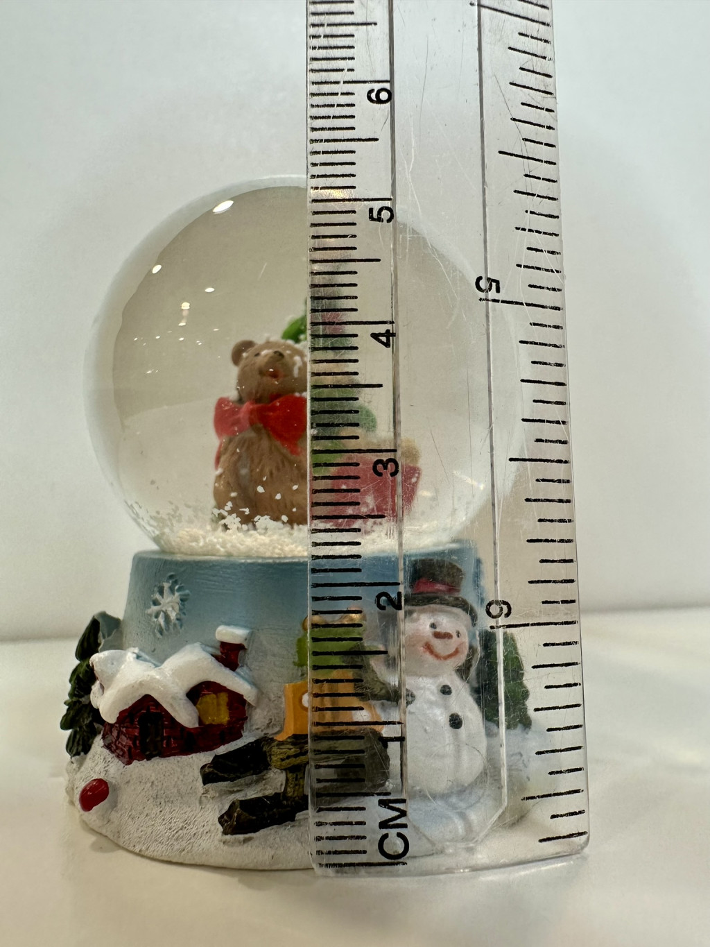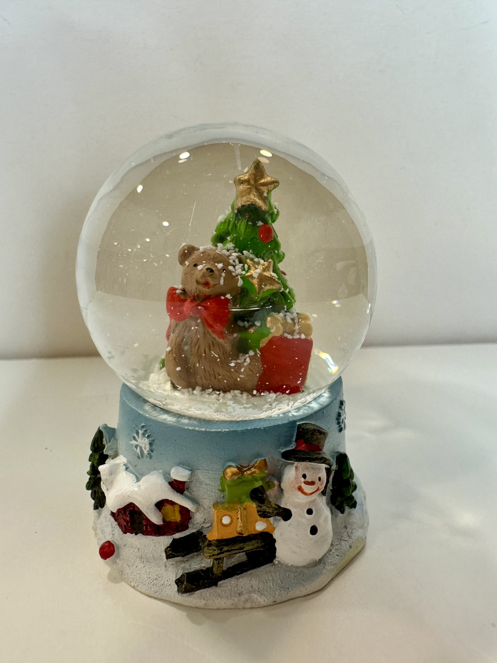 A gömbben kedves kis maci bújik meg az ünnepi karácsonyfa előtt, körülötte hulló hópelyhekkel, az alapon pedig egy hóember, egy havas házikó és egy szánkó teszik teljessé a téli jelenetet.