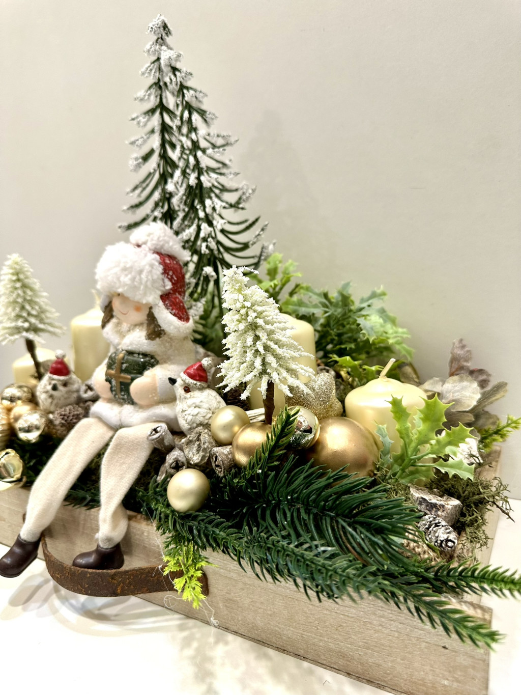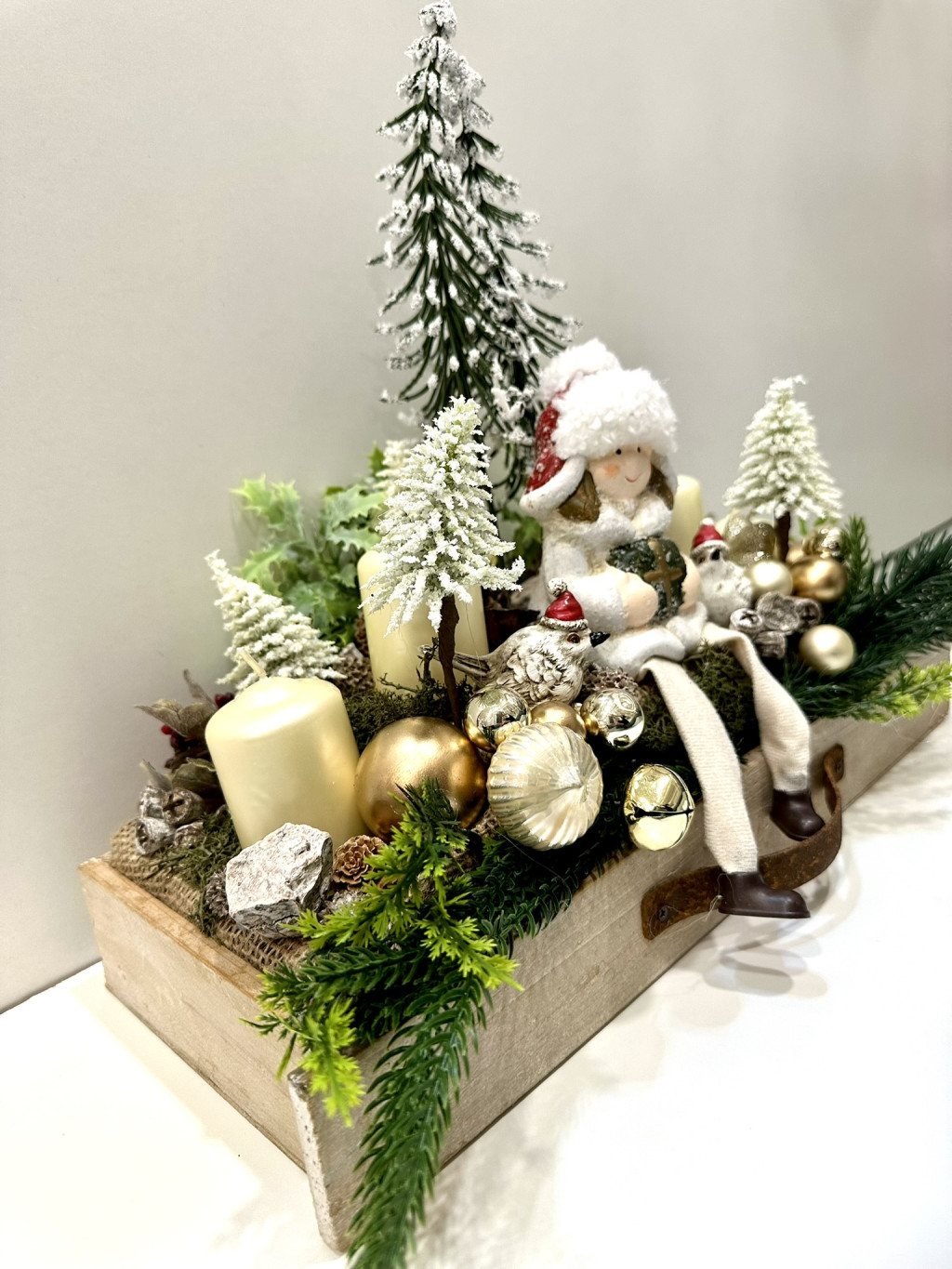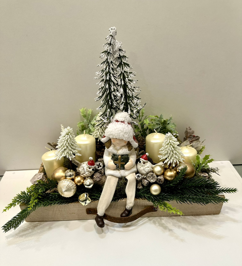 A Téli erdő ajándékos ülőlány adventi dísz egy különleges, szeretettel megalkotott ünnepi dekoráció, amely a karácsony legmeghittebb pillanatait idézi meg. A természetes alapokra épülő kompozícióban puha tapintású ülőlány figura ül egy rusztikus szánkó díszen, körülötte havas mini fenyők, apró madárkák, arany gömbök, termések és sűrű téli zöldek teremtik meg a meghitt téli erdő hangulatát.