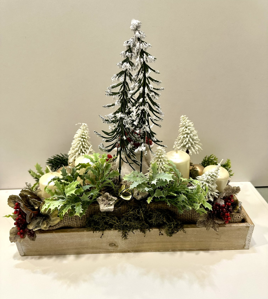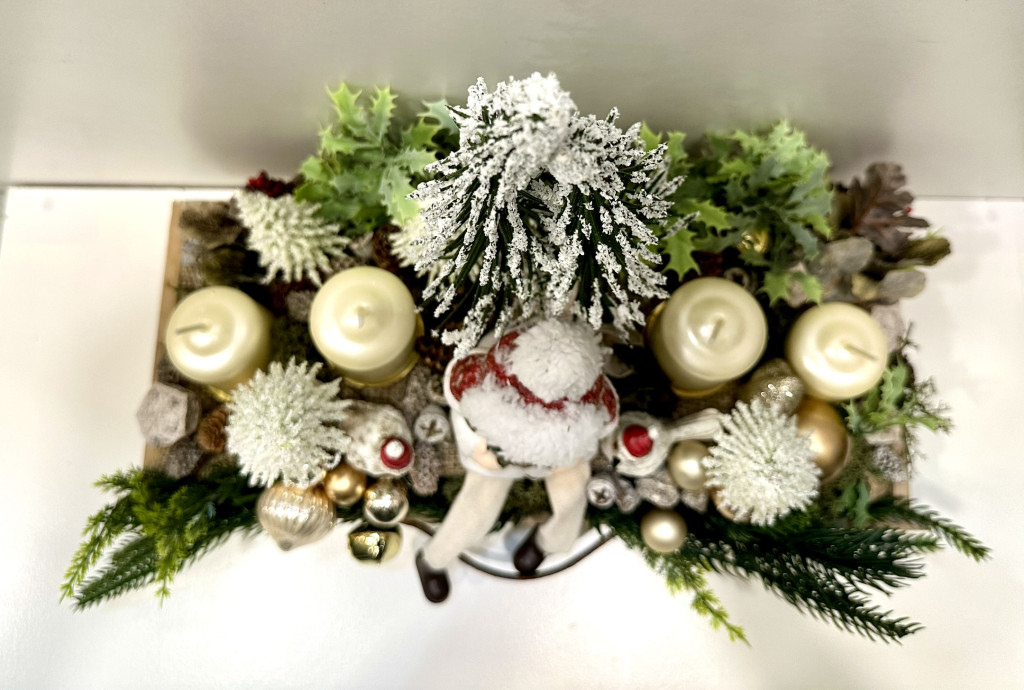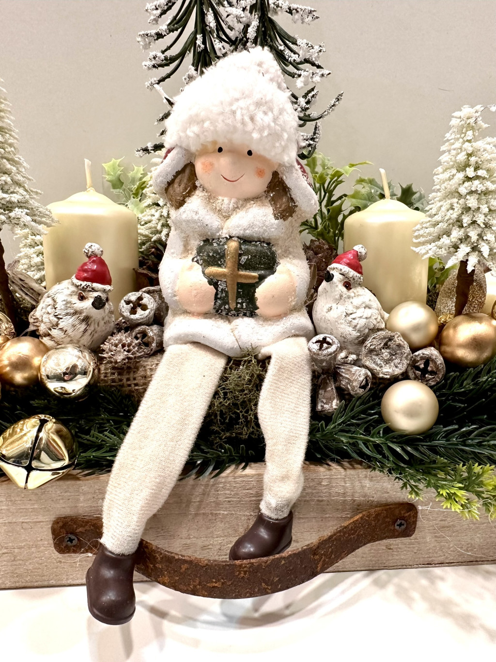 A Téli erdő ajándékos ülőlány adventi dísz egy különleges, szeretettel megalkotott ünnepi dekoráció, amely a karácsony legmeghittebb pillanatait idézi meg. A természetes alapokra épülő kompozícióban puha tapintású ülőlány figura ül egy rusztikus szánkó díszen, körülötte havas mini fenyők, apró madárkák, arany gömbök, termések és sűrű téli zöldek teremtik meg a meghitt téli erdő hangulatát.