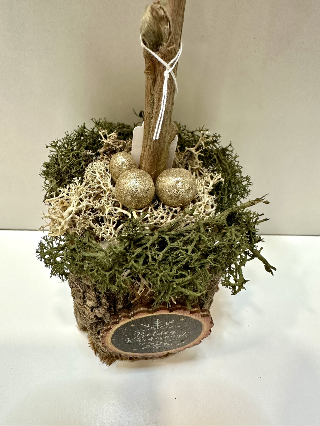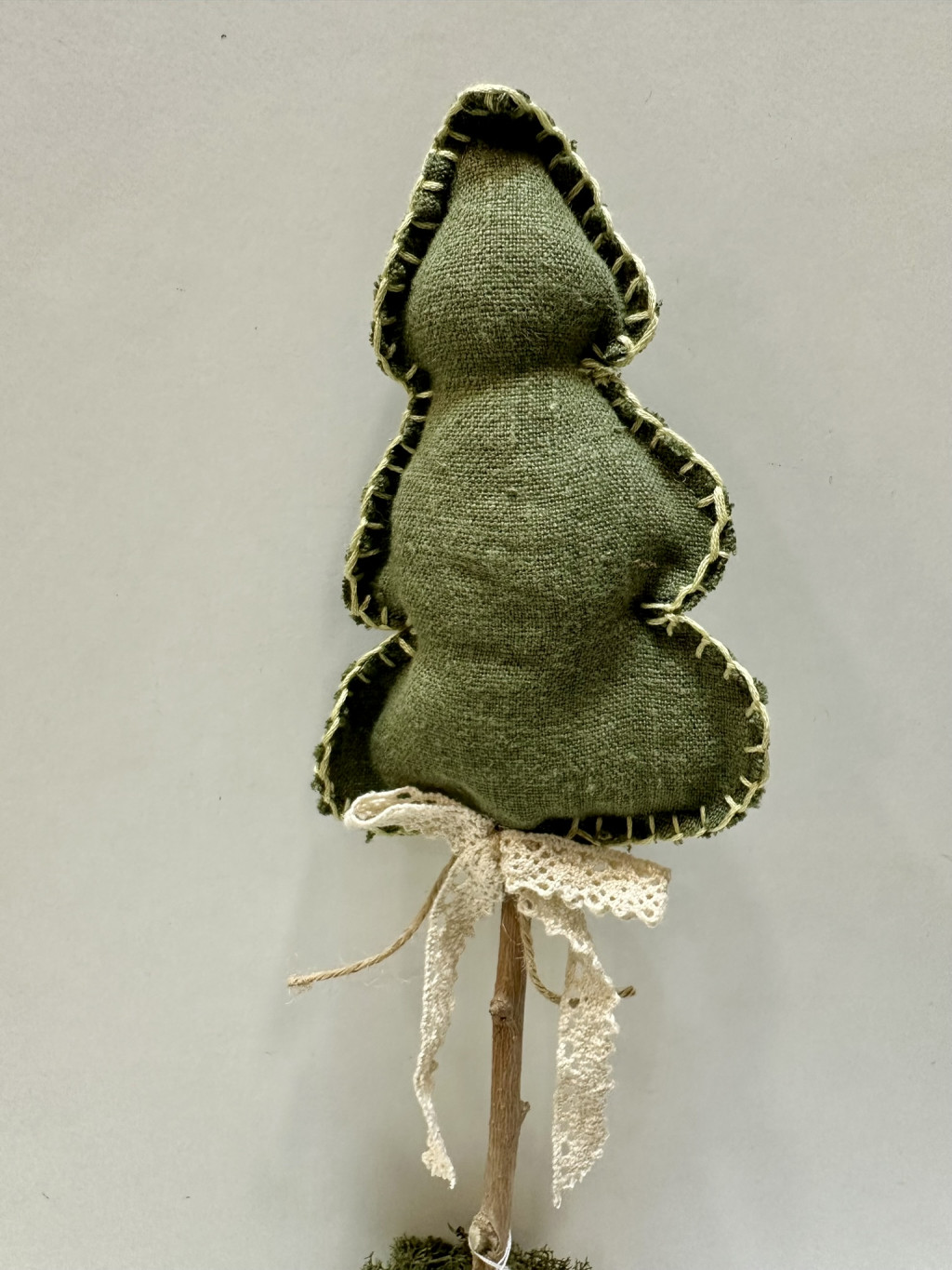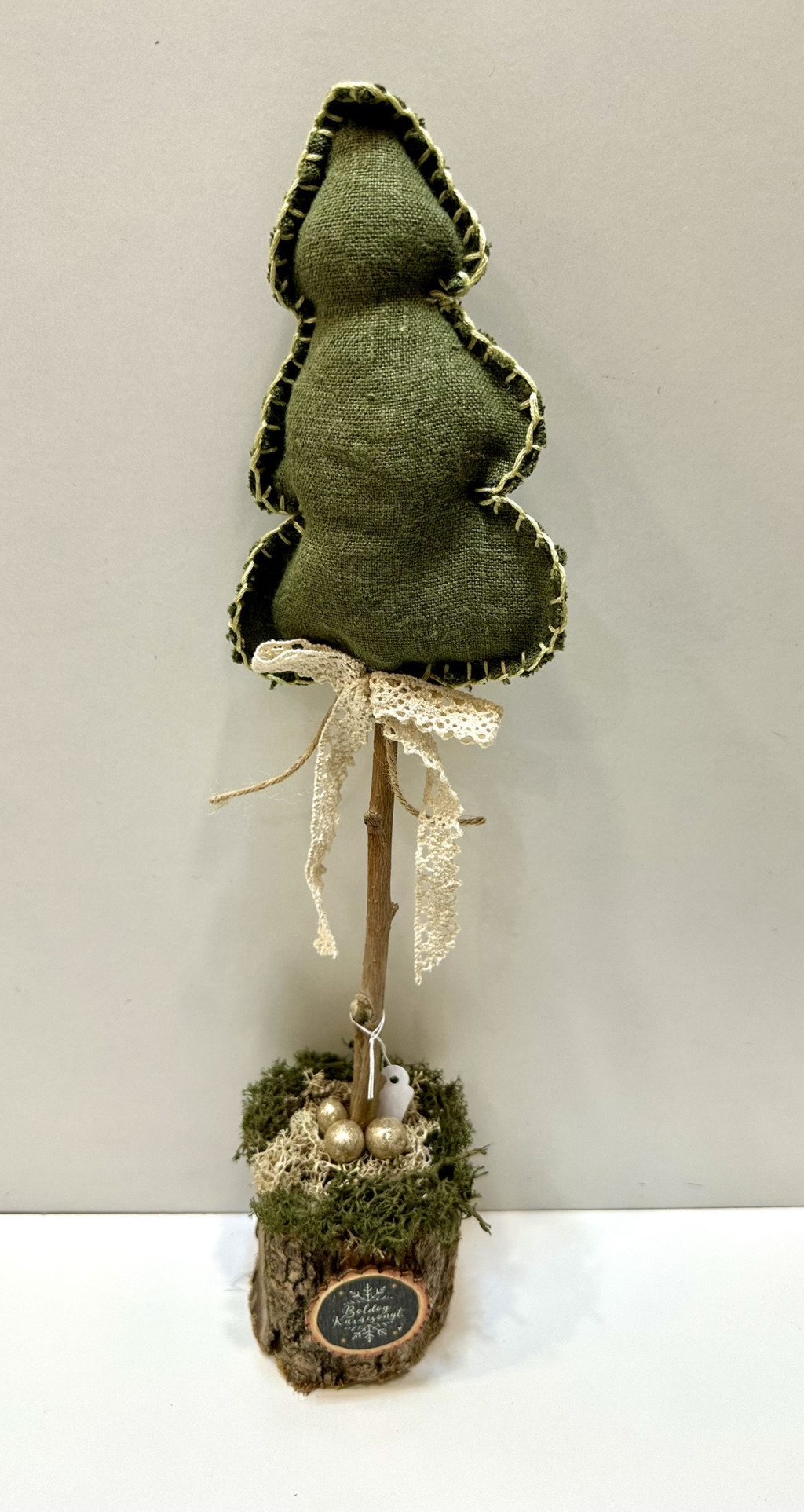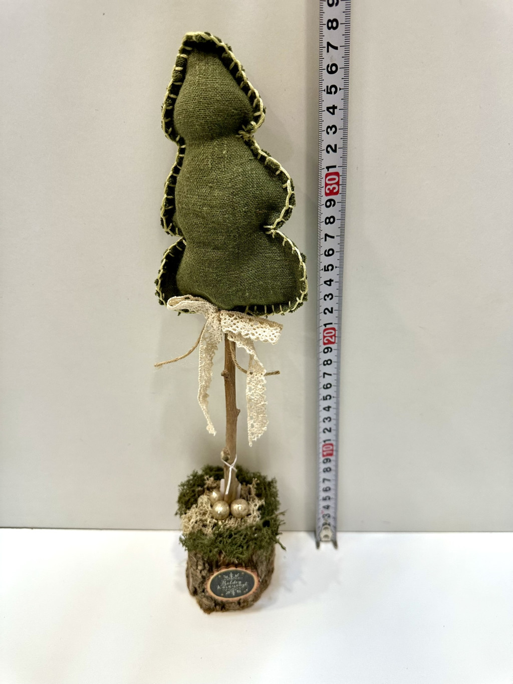 A puha textilből készült fácska egy igazi aprólékos, kézműves darab, amelyet gondosan díszített mohával, famagokkal és csillogó arany gömbökkel tettünk ünnepivé.