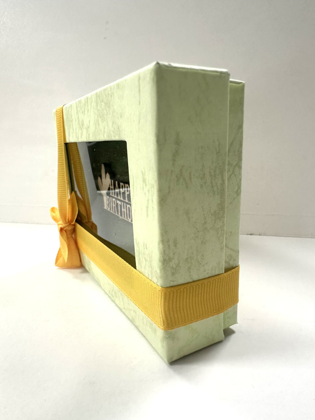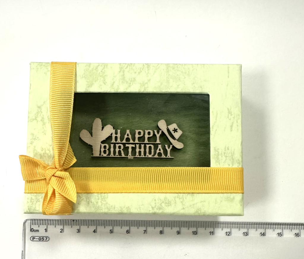Ez a díszdoboz nem csupán csomagolás, hanem maga az ajándék is. A finoman texturált, világoszöld felület, az élénk sárga szalag és a betekintő ablak mögött elhelyezett „Happy Birthday” felirat kaktusszal és western kalappal díszítve igazán egyedi hangulatot áraszt.